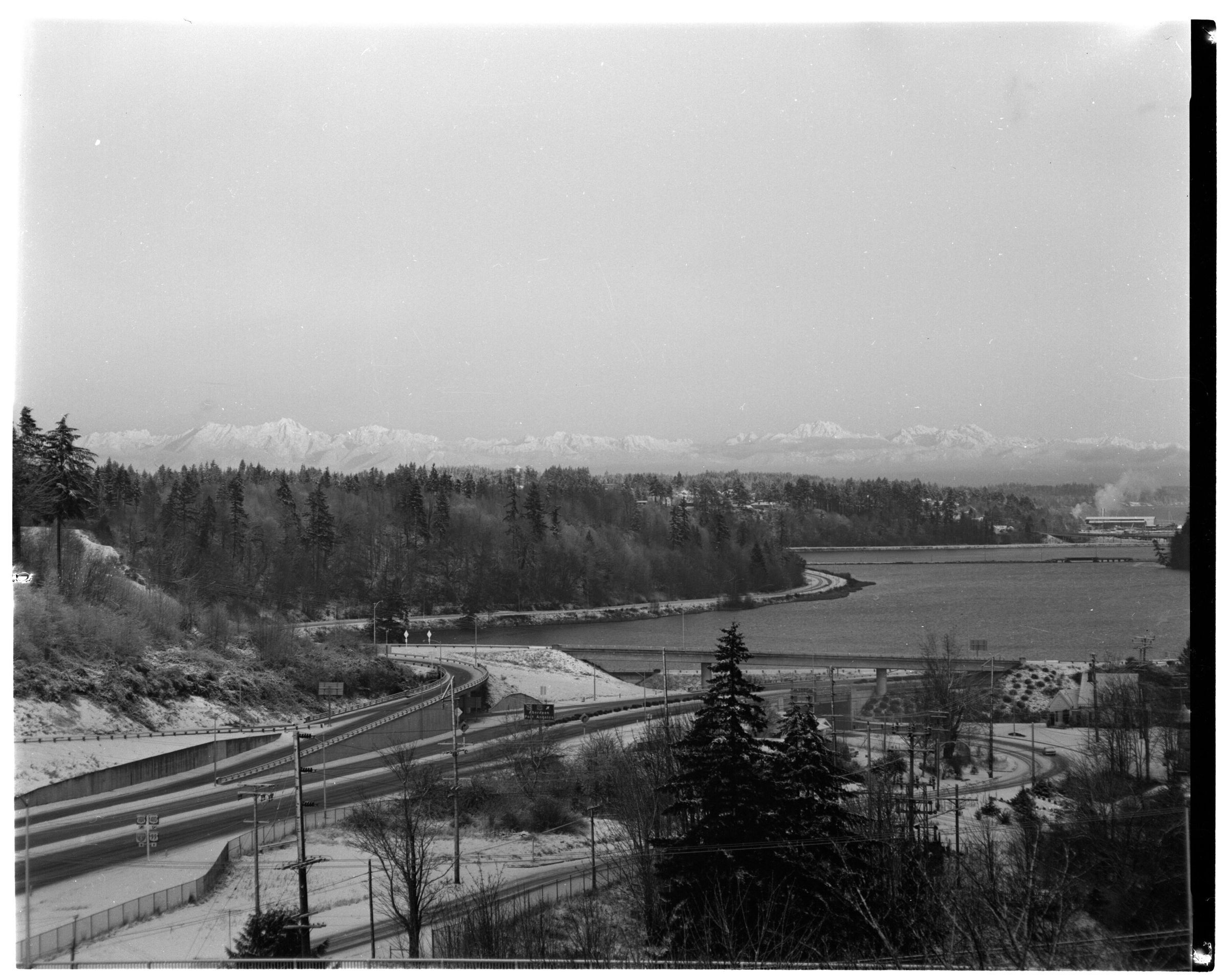 Negative, sheet film. 4 x 5 b&w. Olympic Mountains from M Cellar of Olympia brewery. Snow.