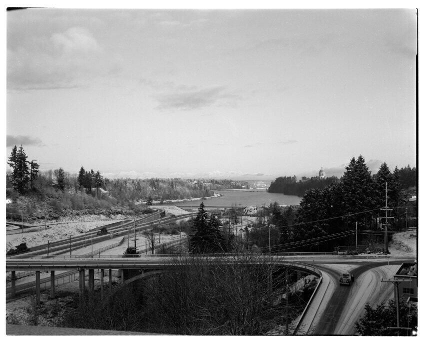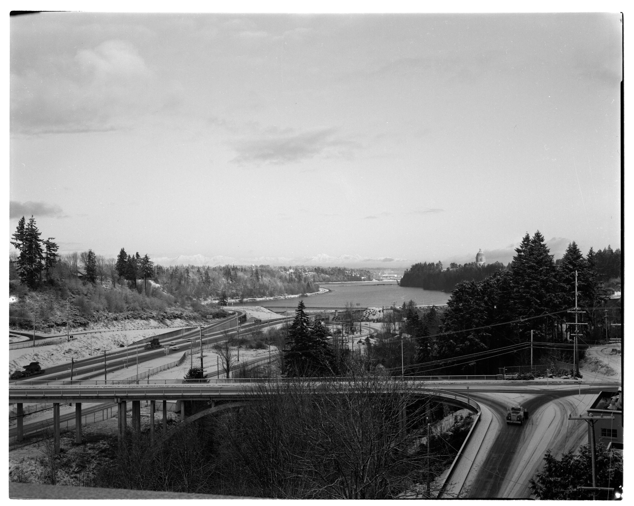Negative, sheet film. 4 x 5 b&w. Olympic Mountains from M Cellar of Olympia brewery. Snow.