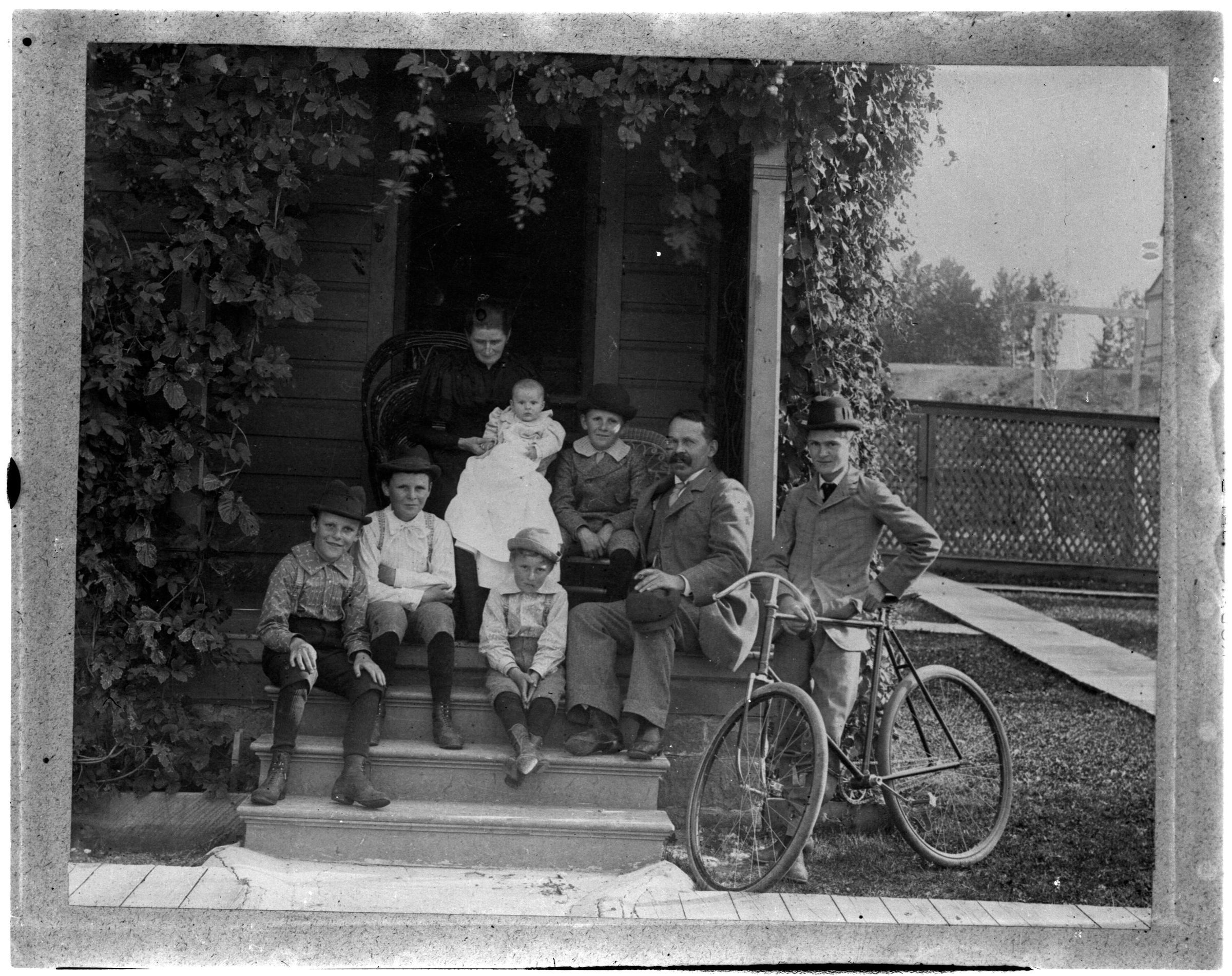 Negative, sheet film. 4 x 5 b&w. Schmidt family posed on porch of house, likely in Portland OR or Montana. Leopold and Johanna Schmidt, with sons Peter, Frank, Leo Jr., Adolph, and Frederick, and daughter Philippine. Peter holds bicycle.Name/Title