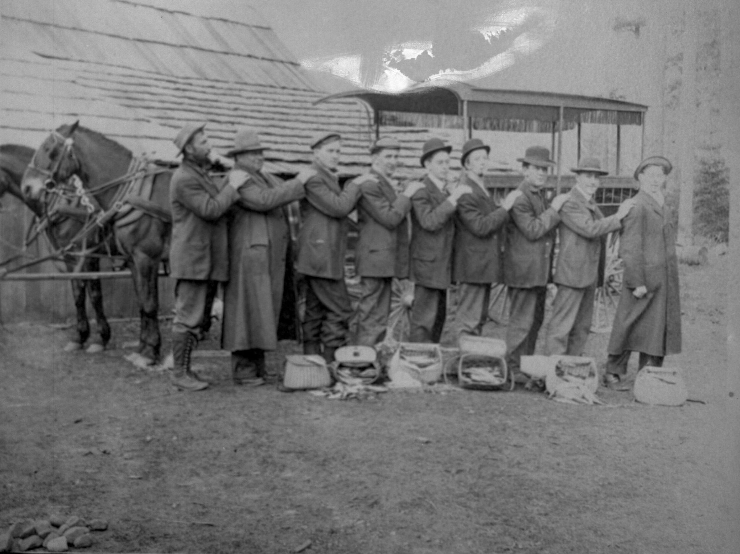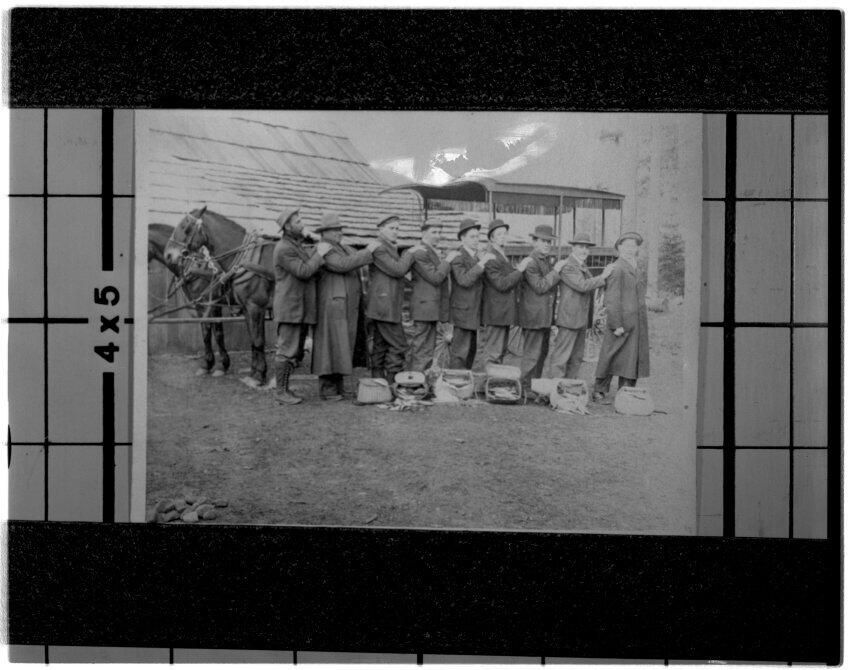 Negative, sheet film. 4 x 5 b&w. Group of men with fishing creels standing in front of horses and wagon. No ID on men. Unknown location.