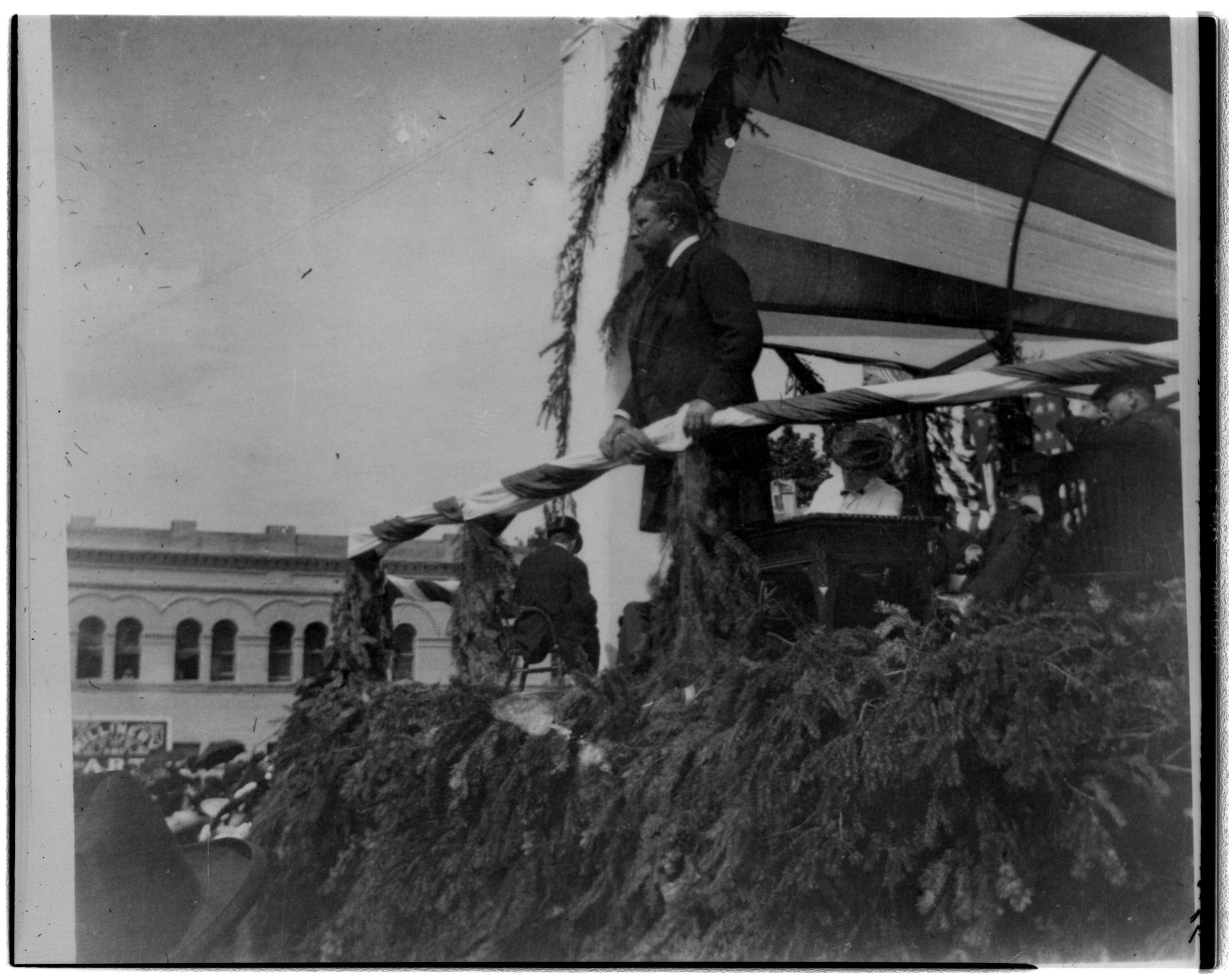 Negative, sheet film. 4 x 5 b&w. President Theodore Roosevelt speaks in Olympia.