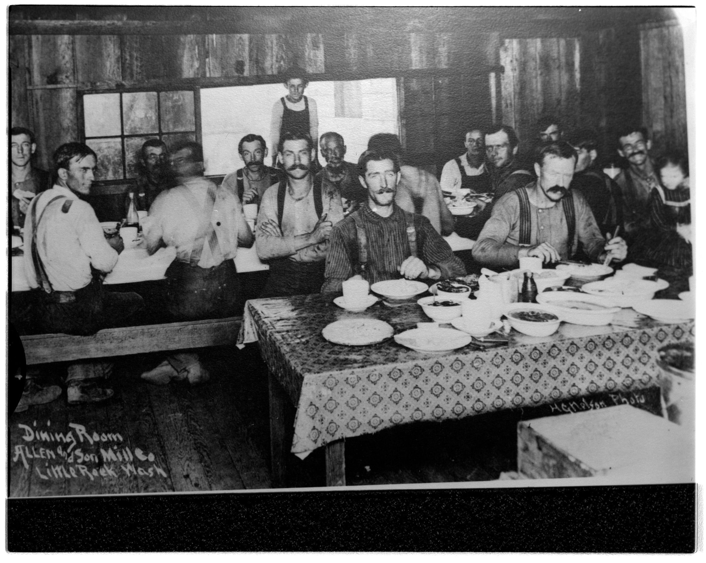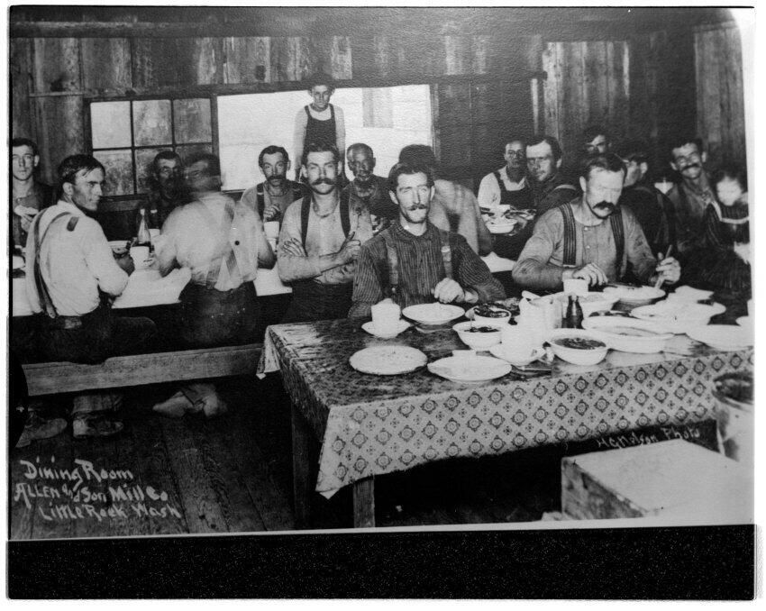 Negative, sheet film. 4 x 5 b&w. Loggers in dining room of logging camp at Allen and Son Mill Company near Little Rock, WA. Photo by H. G. Nelson. No ID on people.