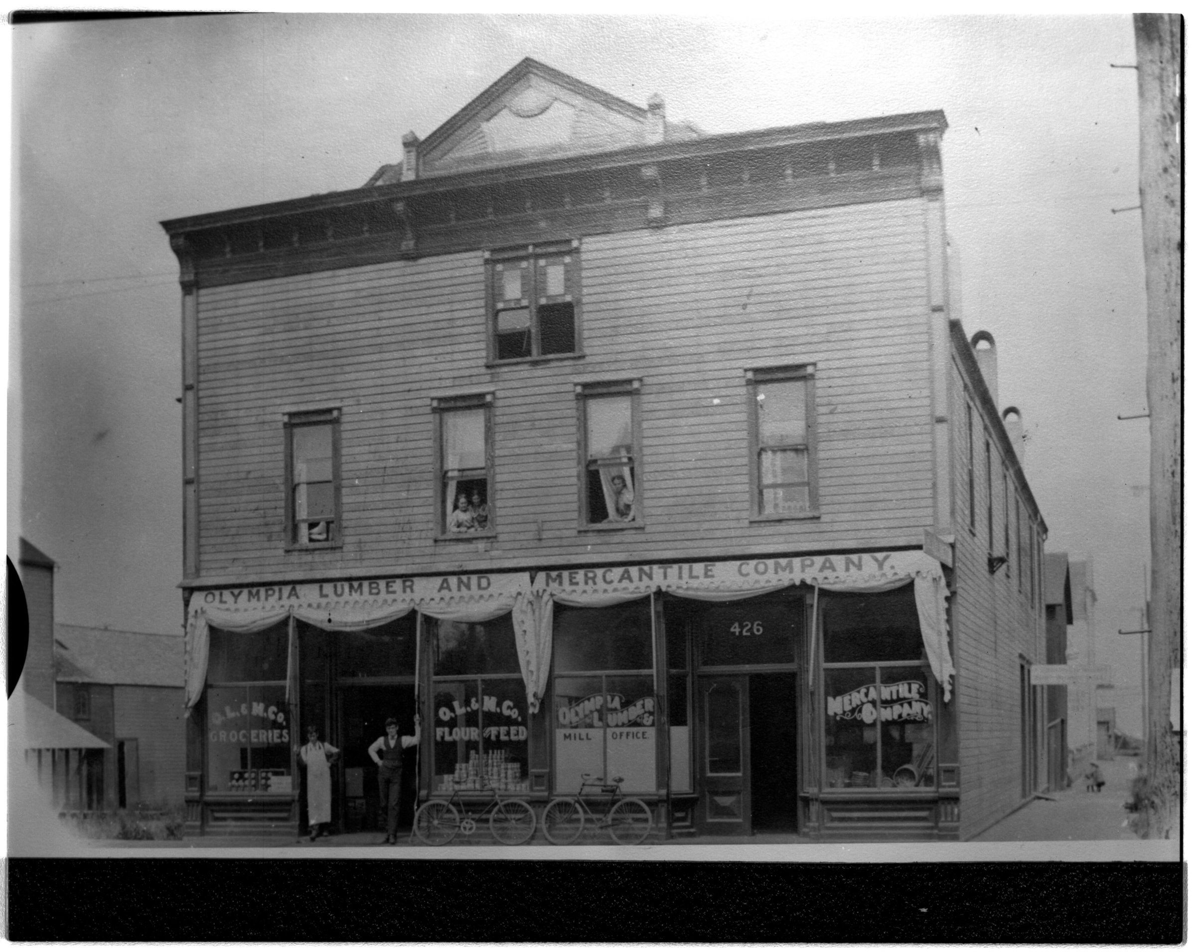 Negative, sheet film. 4 x 5 b&w. Olympia Lumber and Mercantile Company store in Olympia. False front wooden building. No ID on men. Bicycles on boardwalk.