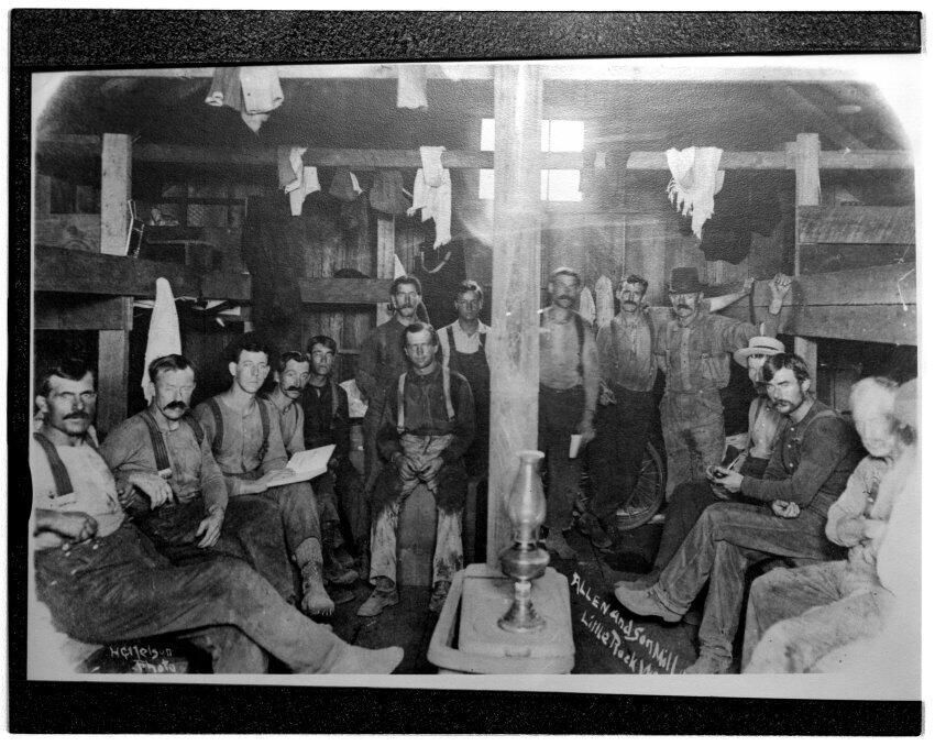 Negative, sheet film. 4 x 5 b&w. Loggers in bunk house of logging camp at Allen and Son Mill Company near Little Rock, WA. Photo by H. G. Nelson. No ID on people.
