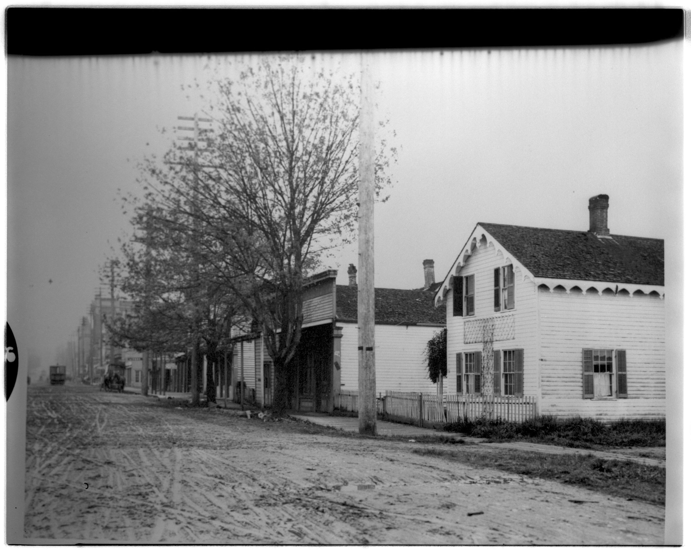 Negative, sheet film. 4 x 5 b&w. Olympia business street with wooden buildings