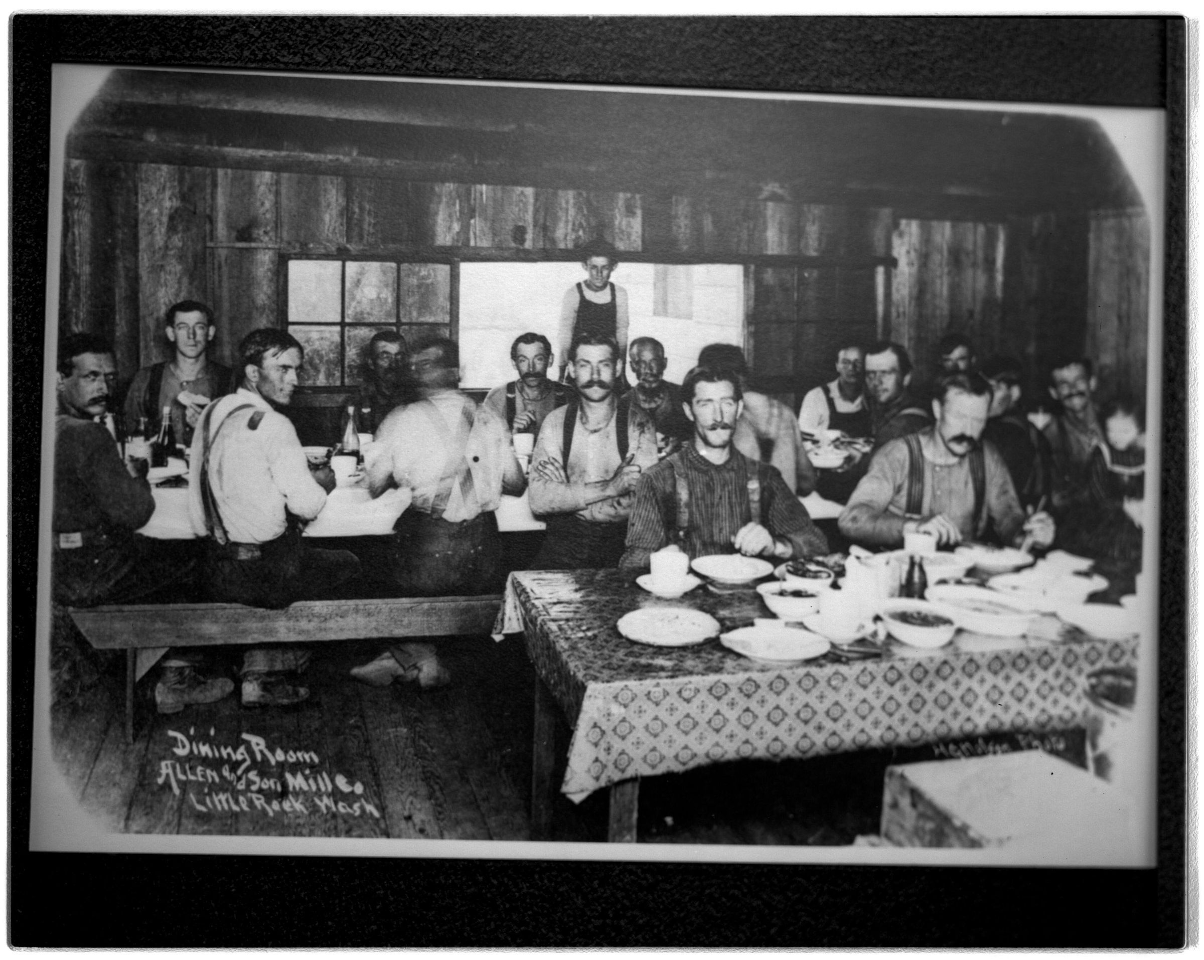 Negative, sheet film. 4 x 5 b&w. Loggers in dining room of logging camp at Allen and Son Mill Company near Little Rock, WA. Photo by H. G. Nelson. No ID on people.