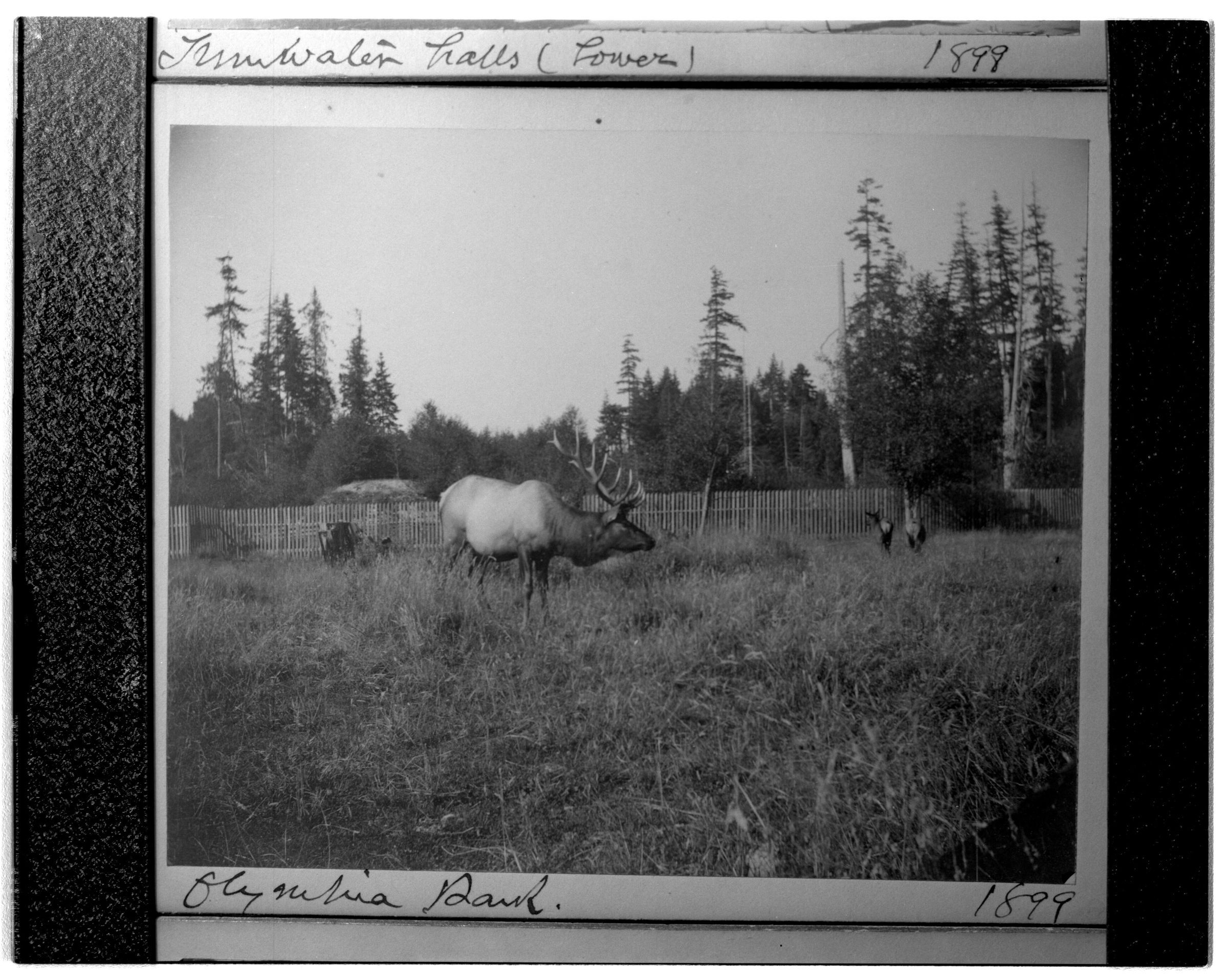 Negative, sheet film. 4 x 5 b&w. Bull elk in Tumwater's wildlife park at the upper falls of the Deschutes River.
