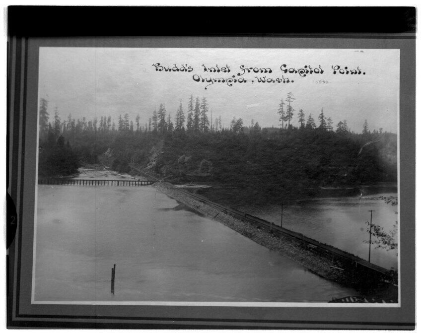 Negative, sheet film. 4 x 5 b&w. Budd's Inlet from Capitol Point, Olympia. Railroad tracks cross water.