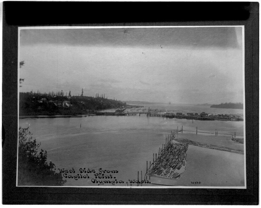 Negative, sheet film. 4 x 5 b&w. West side of Olympia on left, looking north from Capitol Point. 4th Avenue bridge cuts across center of photo.
