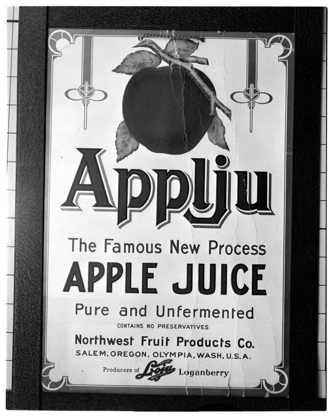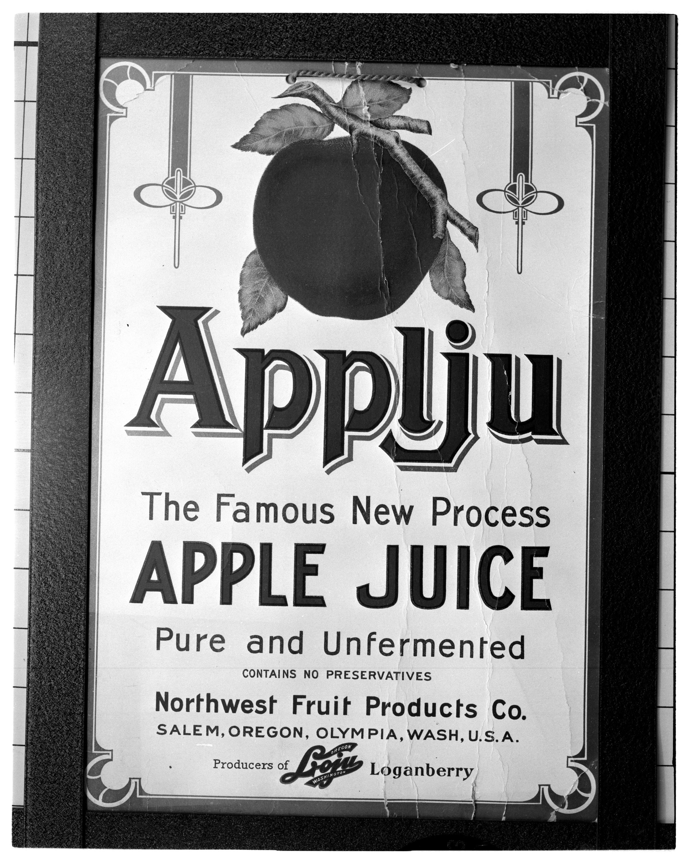 Negative, sheet film. 5 x 4 b&w. Paper label for Applju, apple juice made by the Northwest Fruit Products Company of Tumwater WA and Salem OR.