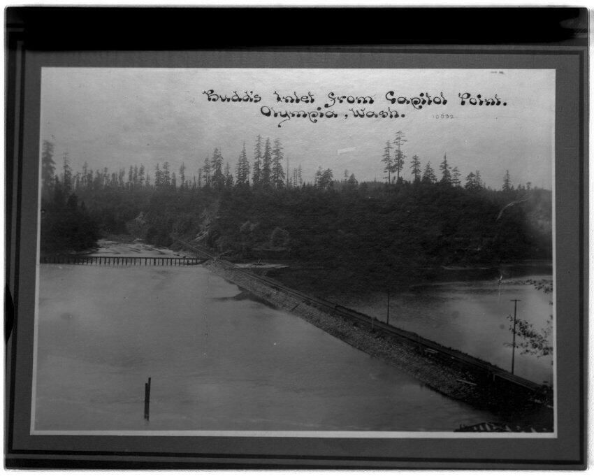 Negative, sheet film. 4 x 5 b&w. Budd's Inlet from Capitol Point, Olympia. Railroad tracks cross water.