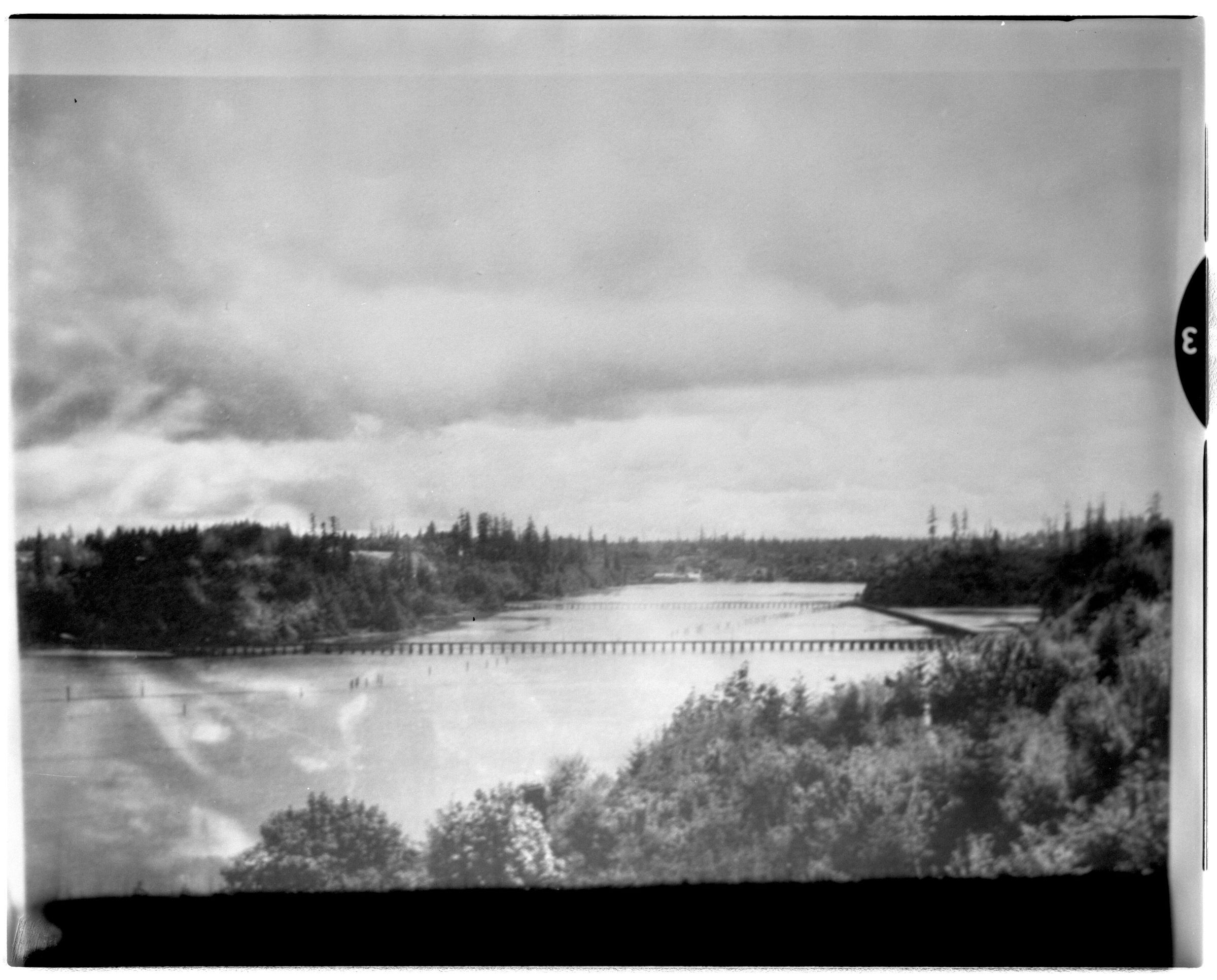 Negative, sheet film. 4 x 5 b&w. Budd Inlet looking south. Railroad bridge across water. Capitol hill area on left.
