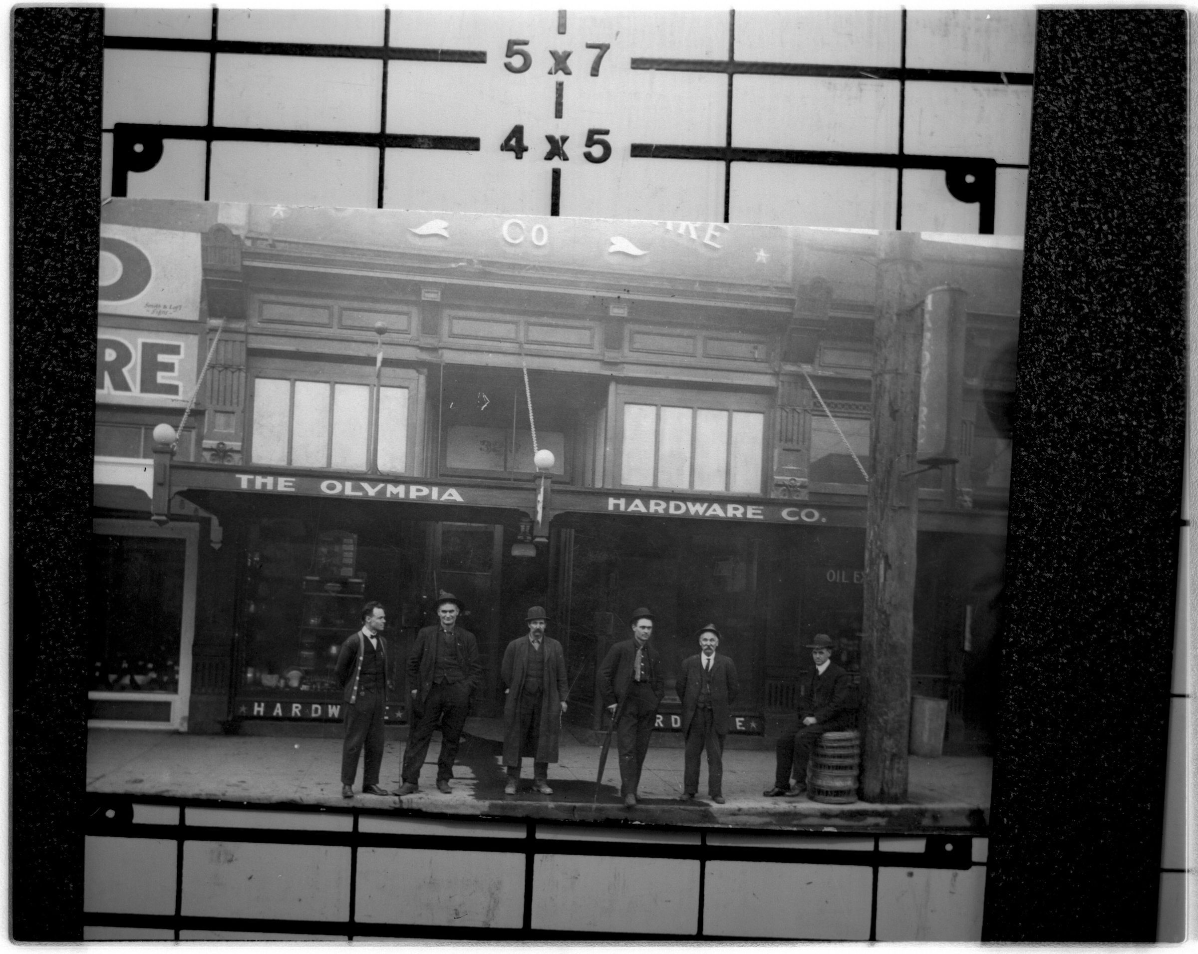 Negative, sheet film. 4 x 5 b&w. The Olympia Hardware Company building in Olympia. No ID on men.