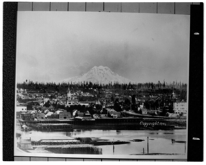 Negative, sheet film. 4 x 5 b&w. View of Olympia from west side, looking east over Budd Inlet with Mt. Rainier in background.