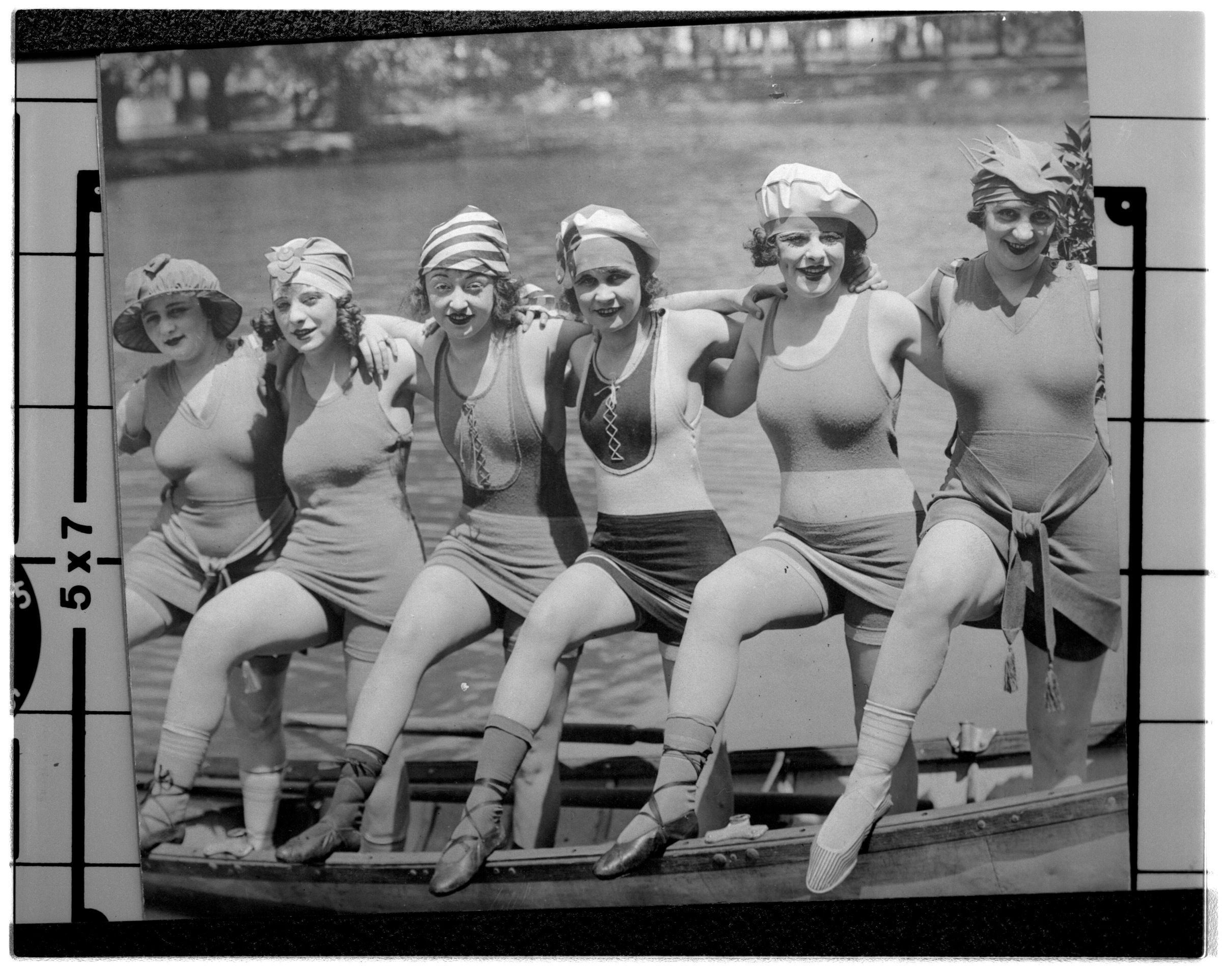 Negative, sheet film. 4 x 5 b&w. Group of girls in swimming costumes, with small boat. No ID on girls.
