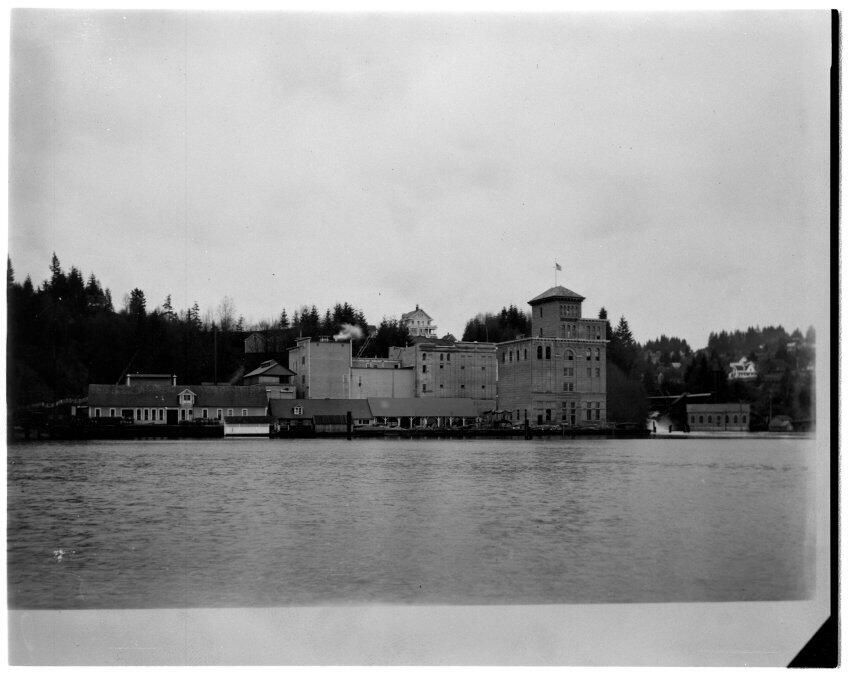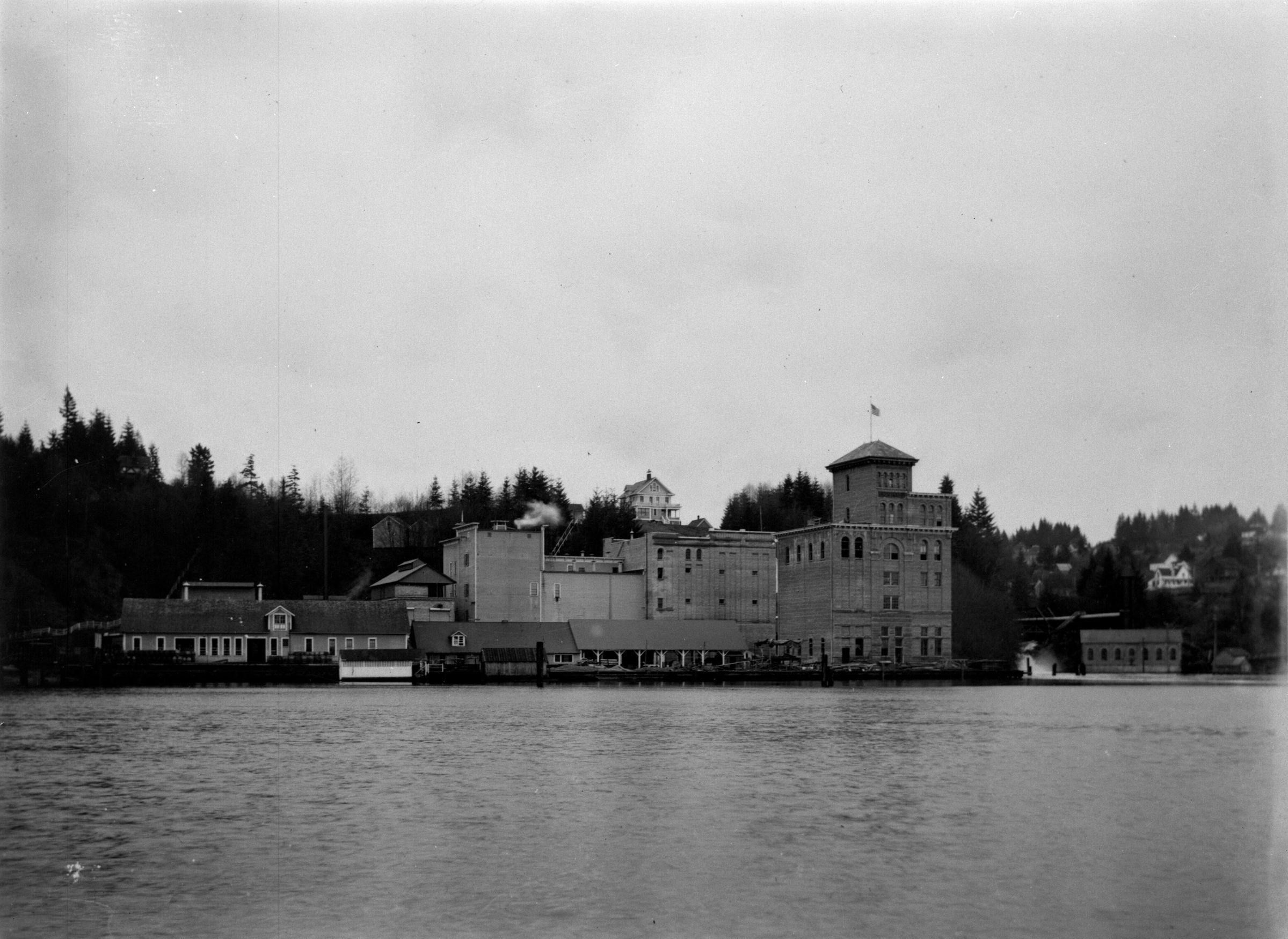 Negative, sheet film. 4 x 5 b&w. Olympia brewery taken from across estuary.