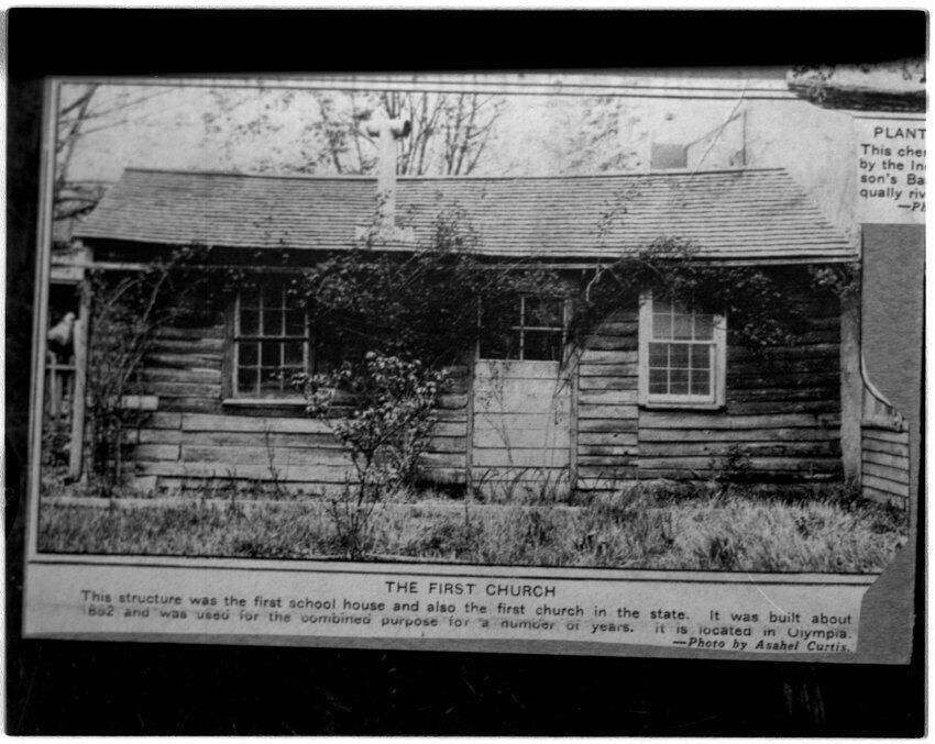Negative, sheet film. 4 x 5 b&w. Photograph of newspaper clipping glued into scrapbook. Caption identifies the first school and first church in Washington state, alleged to have been built in 1862 in Olympia. This may be incorrect, as churches and schools were certainly established before 1862. Original photo by Asahel Curtis.Name/Title