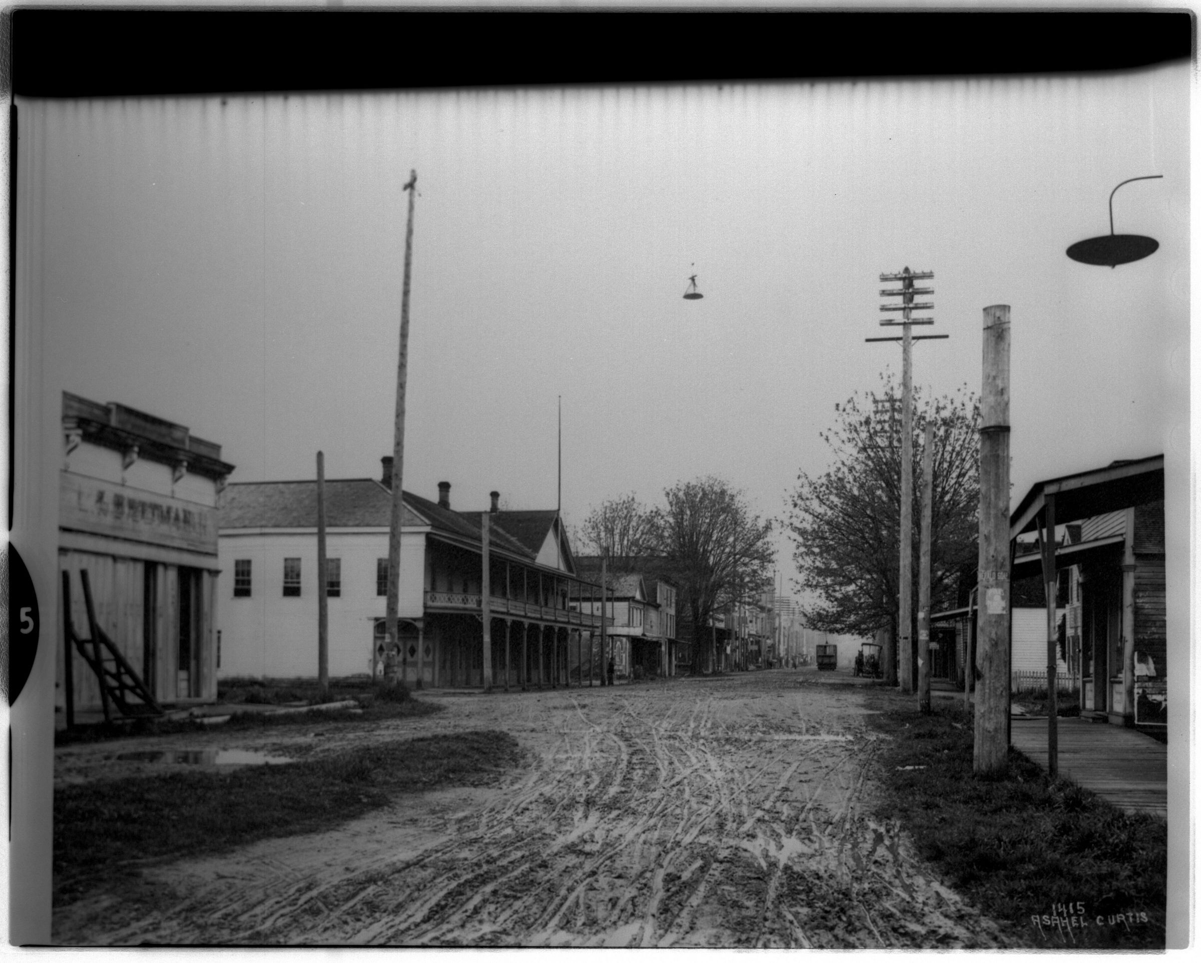 Negative, sheet film. 4 x 5 b&w. Olympia street scene. Bettman store on left.