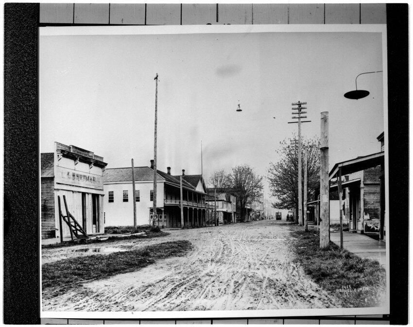 Negative, sheet film. 4 x 5 b&w. Olympia street scene. Bettman store on left.