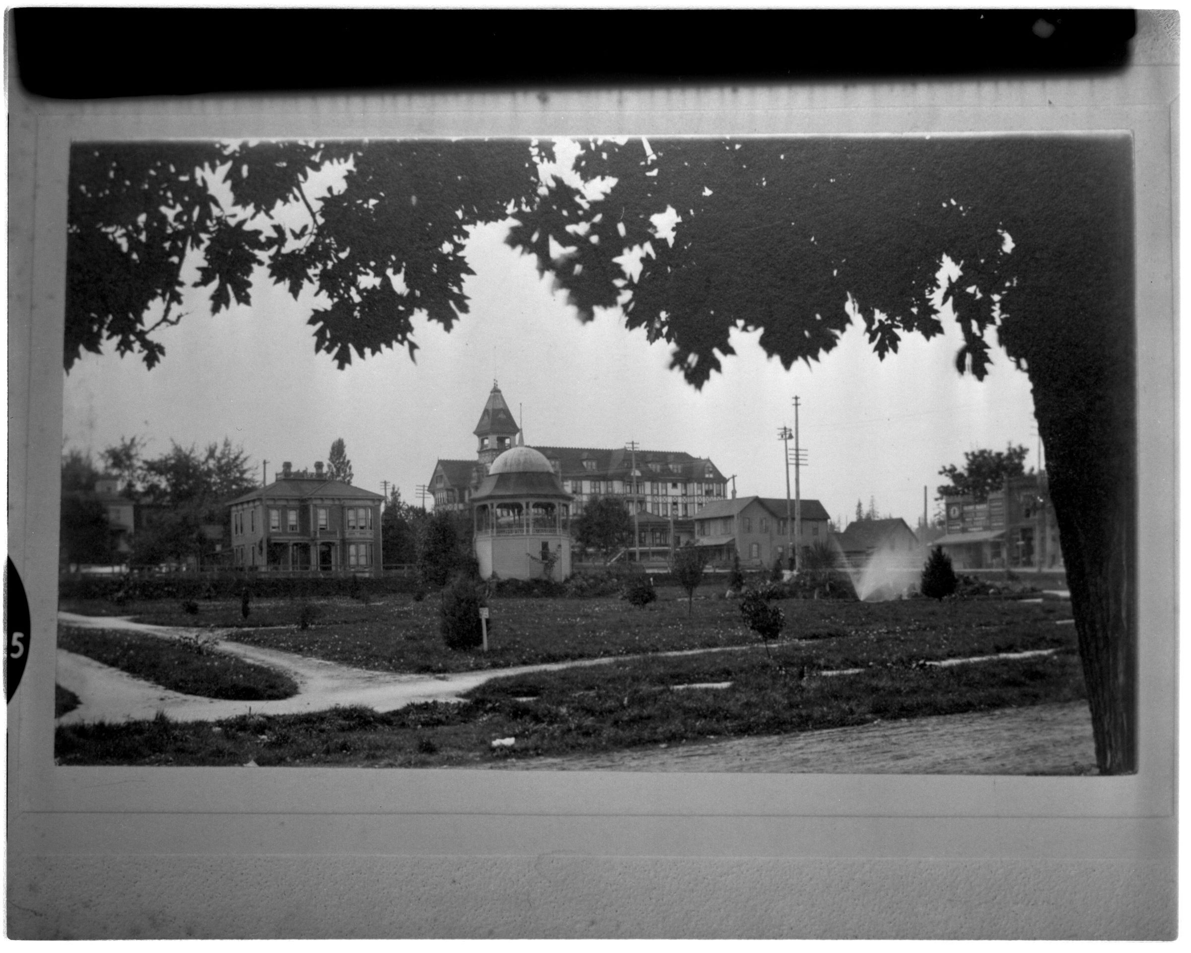 Negative, sheet film. 4 x 5 b&w. Olympia's Sylvester Park and bandstand in foreground, with Hotel Olympia in background. Looking west.