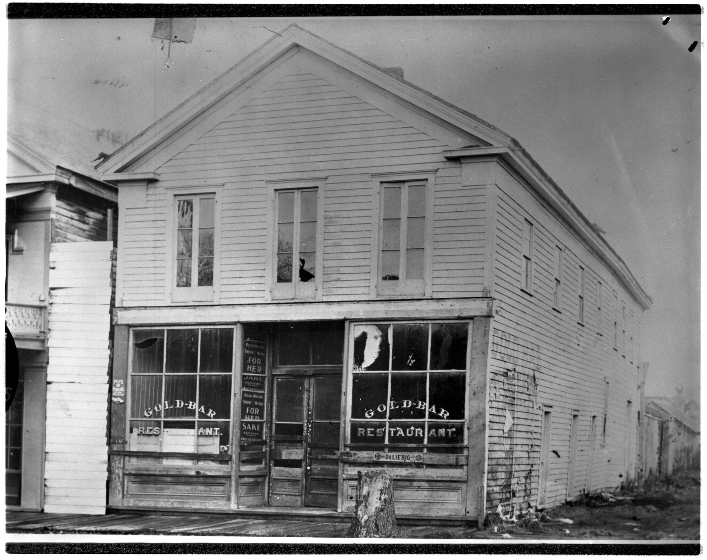 Negative, sheet film. 4 x 5 b&w. Isaac Stevens was governor when first legislature was held upstairs in this building in 1854. The building was located between Olympia Avenue and State Street on Capitol Way. The legislative building was then known as the Parker & Colter Building (mercantile and express business run by John G. Parker and Henry Colter). Later, building became the Gold Bar Restaurant. On left is Young Hotel.Name/Title
