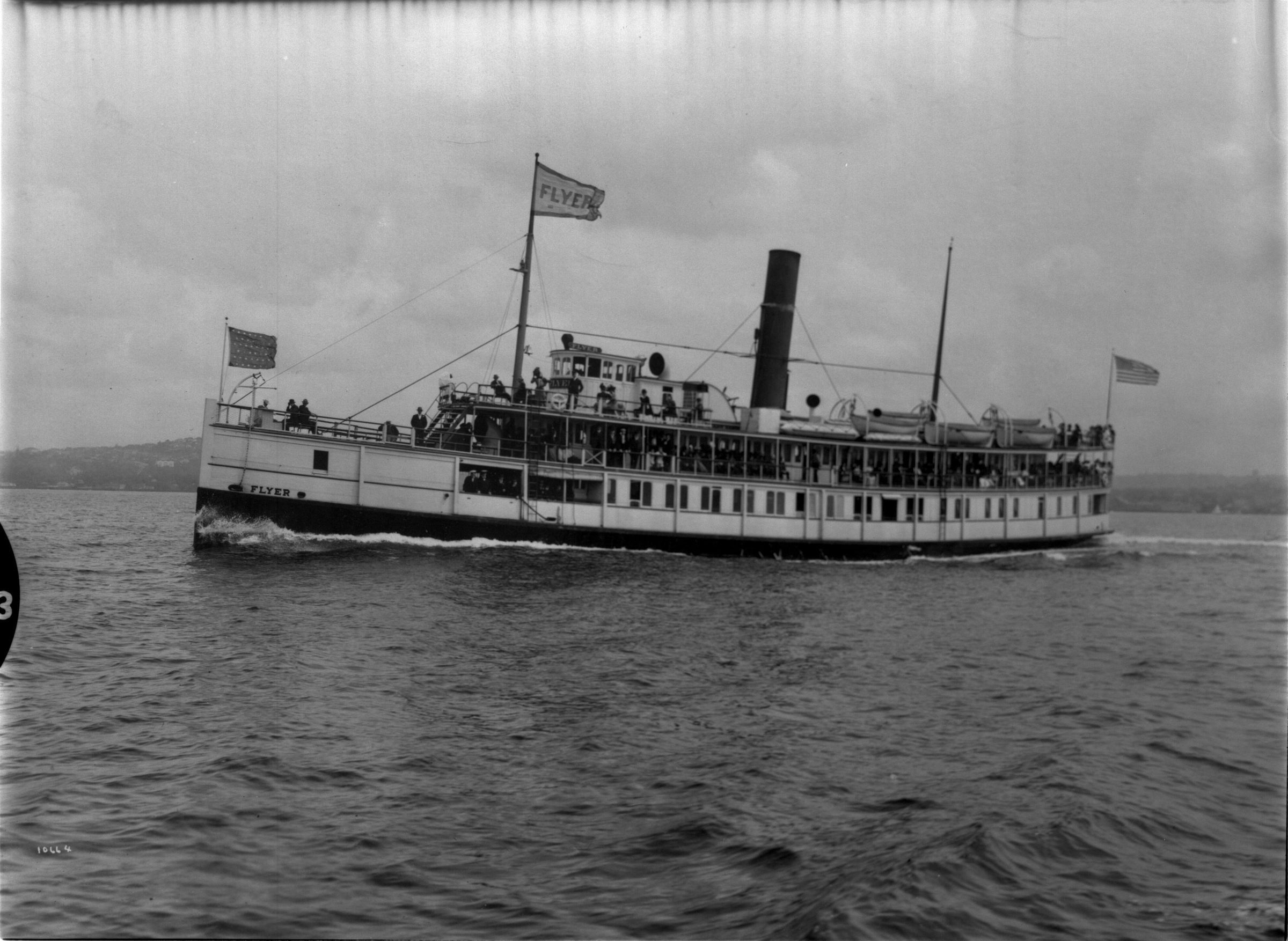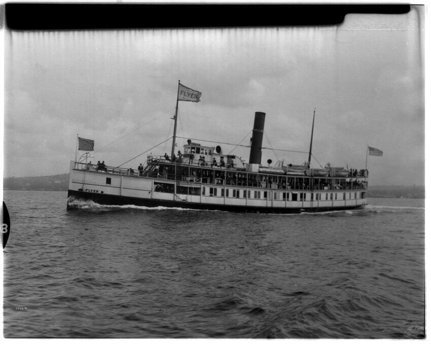 Negative, sheet film. 4 x 5 b&w. The Flyer, part of the Mosquito Fleet of small ships that carried passengers and freight around Puget Sound. The Flyer was built in Portland OR in 1891, and served on Puget Sound until 1929. She reportedly ran more miles at high speed than any other inland vessel in the world. After years on the Sound, and a stint in the Navy, she was finally burned in 1929. Her whistle survives on another Mosquito Fleet ship, the Viriginia V.Name/Title