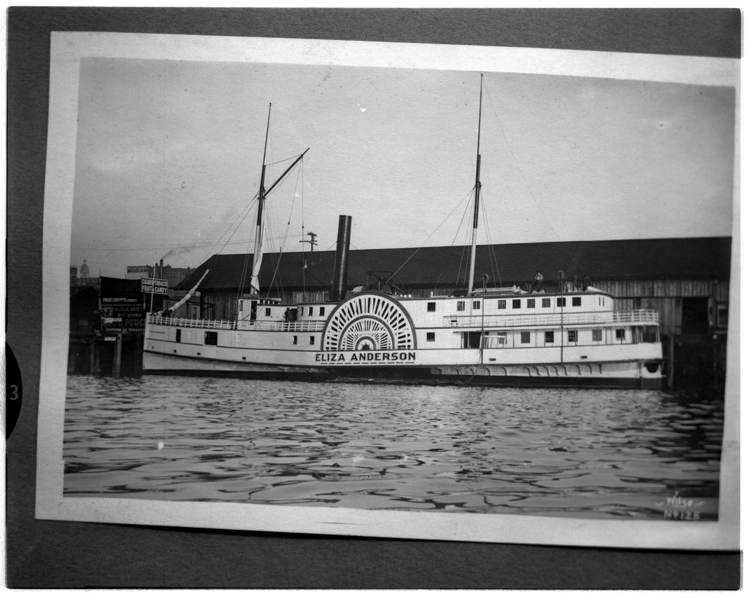 Negative, sheet film. 4 x 5 b&w. 1502 D. The side-wheeler Eliza Anderson, part of the Mosquito Fleet of small ships that carried passengers and freight around Puget Sound. This ship operated from 1858 to 1898, mostly on Puget Sound but also in Alaska. She was anchored in Dutch Harbor, Alaska, when she broke free and was washed up on a nearby beach, spelling the end of her career.Name/Title