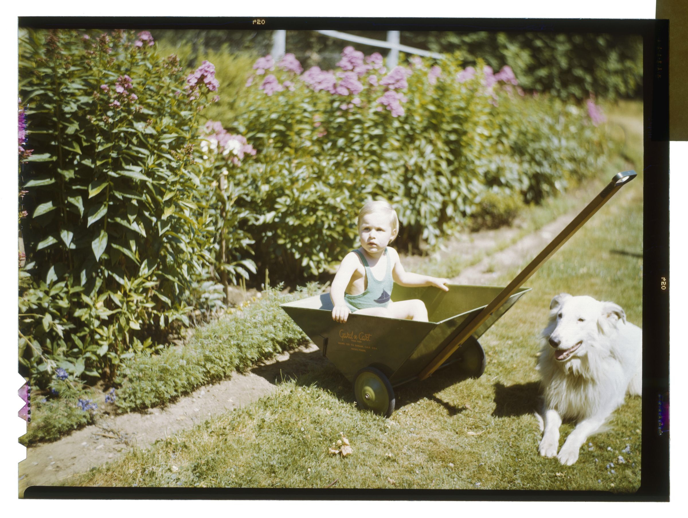 Negative, sheet film. 3 x 4 positive. Unidentified child in swimsuit with wheelbarrow and Schmidt family dog, at Schmidt House.