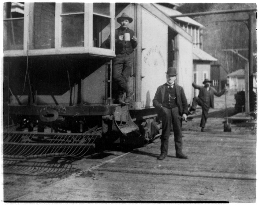 Negative, sheet film. 4 x 5 b&w. Streetcar. Olympia Light and Power Company trolley came to Olympia brewery, transported beer to bottling department on Water Street in Olympia and to docks in Olympia. View shows trolley at brewery, looking east. Motorman on trolley is "Shorty." Man in derby hat is "Duke" who ran the brewery's hospitality room. In background is Fred Brey, brewery yardman.Name/Title
