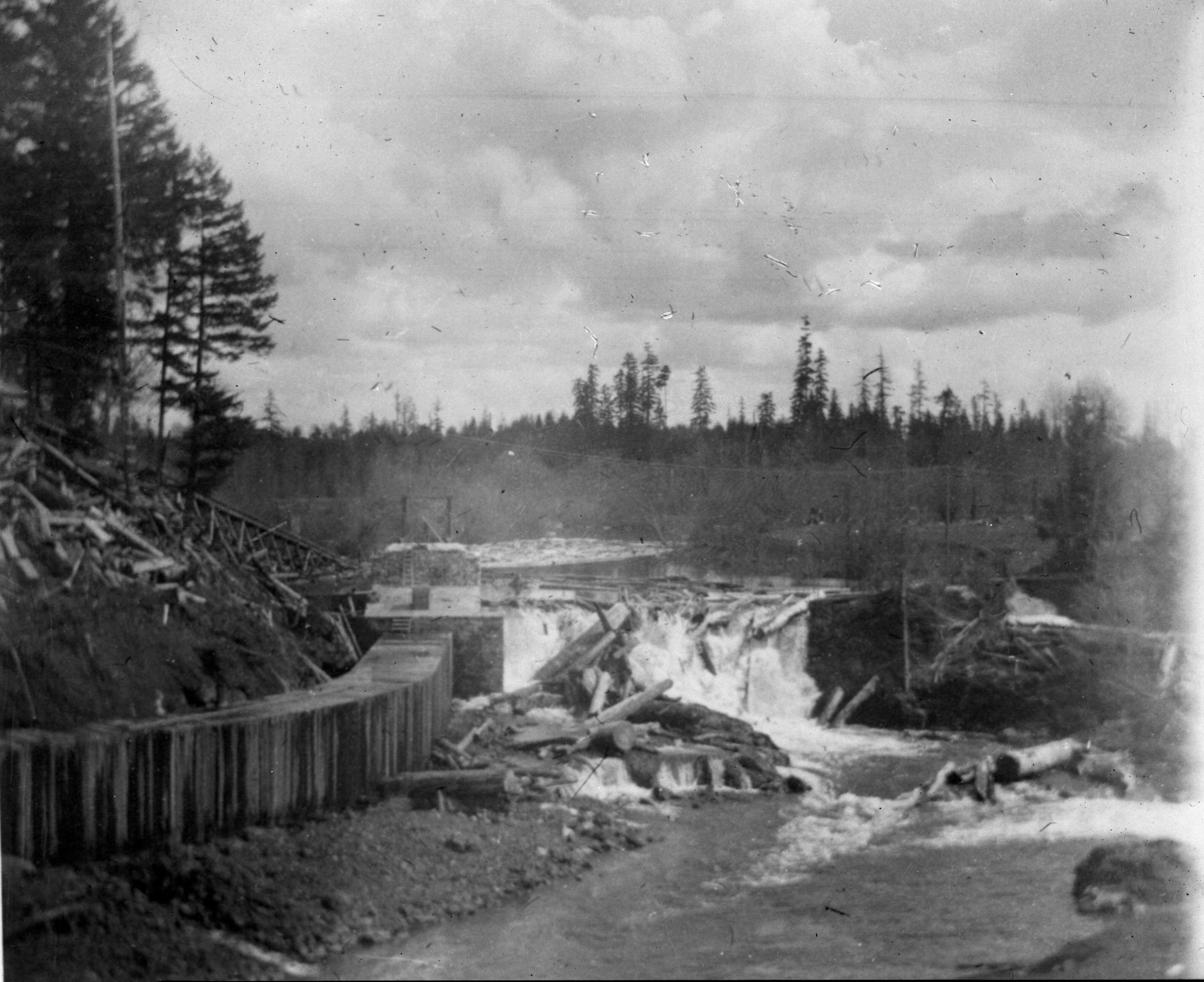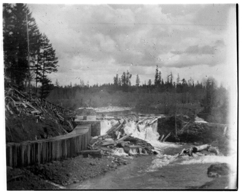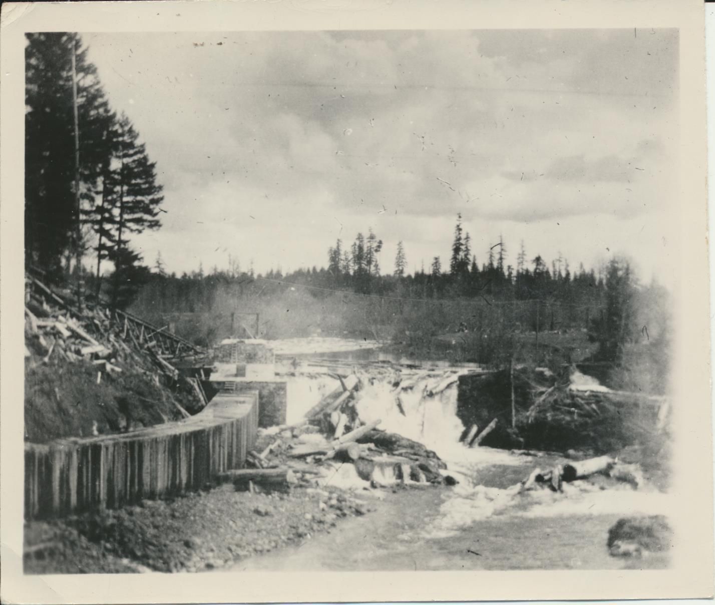 Negative, sheet film. 4 x 5 b&w. Upper falls of Deschutes River, Tumwater WA, showing wooden flume that led water downriver to powerhouse.
