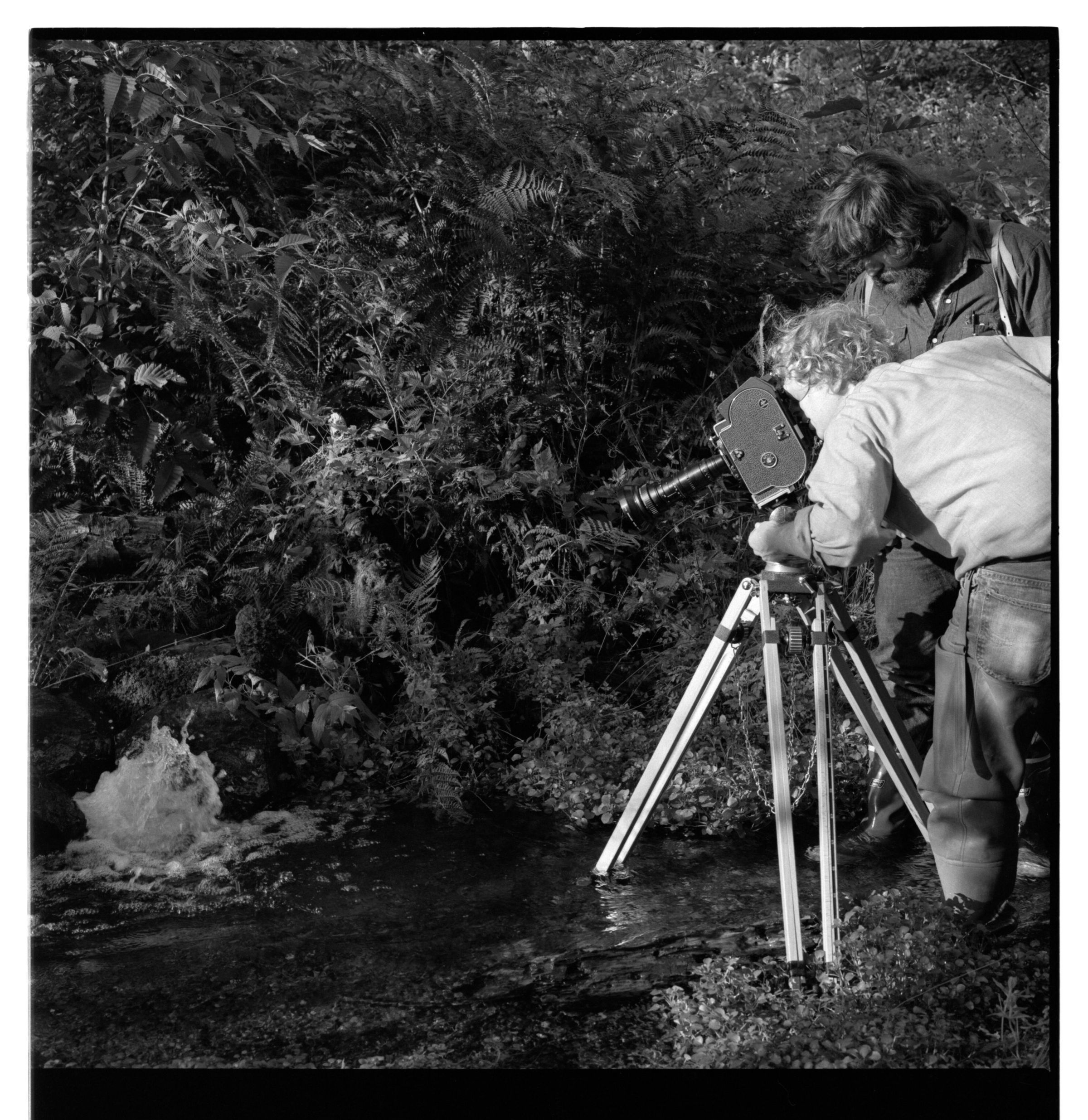 Negative, sheet film. 2 x 2 b&w. Still photo of filming of commercial showing re-creation of Leopold Schmidt taking samples of water from artesian spring in Tumwater. No ID on people.