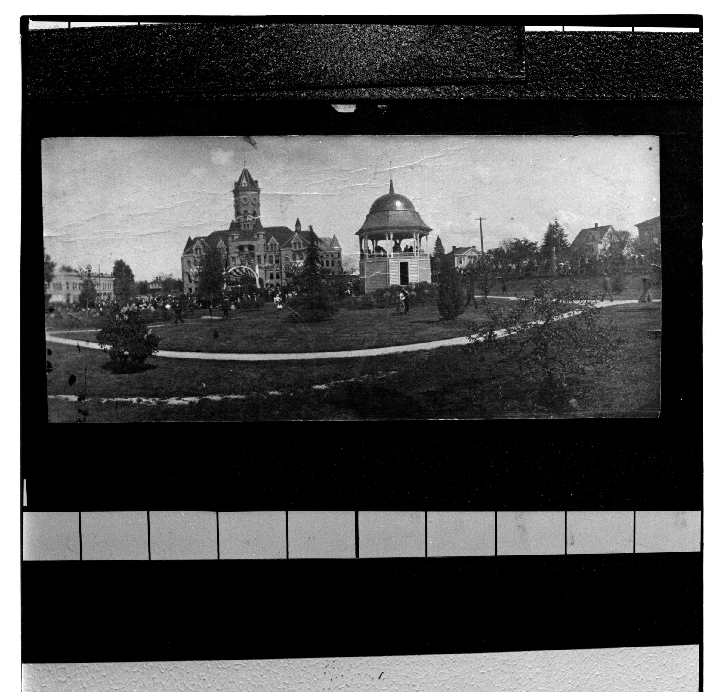 Negative, sheet film. 2 x 2 b&w. Sylvester Park in downtown Olympia, with Thurston County Courthouse in background. View looking east.