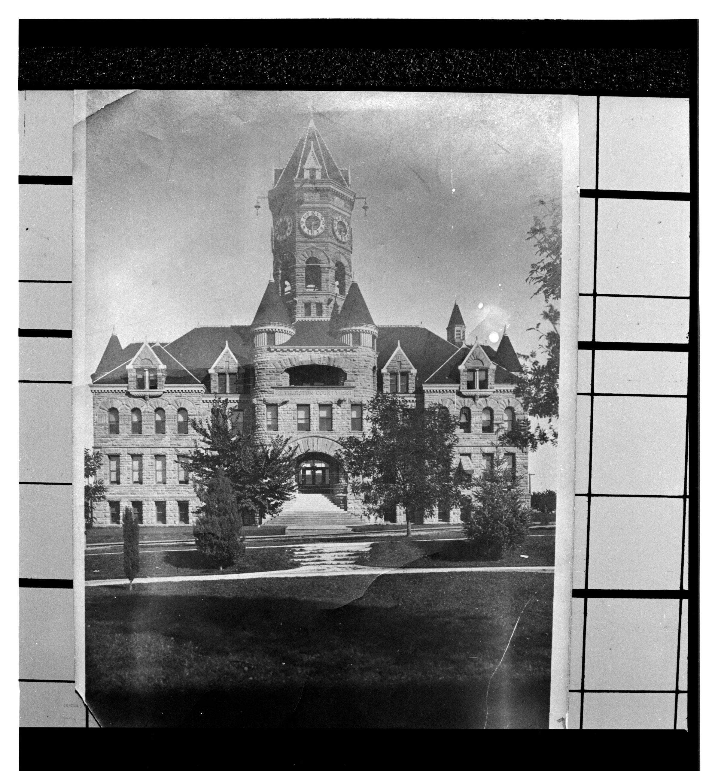 Negative, sheet film. 2 x 2 b&w. Thurston County Courthouse with original clocktower, in downtown Olympia.
