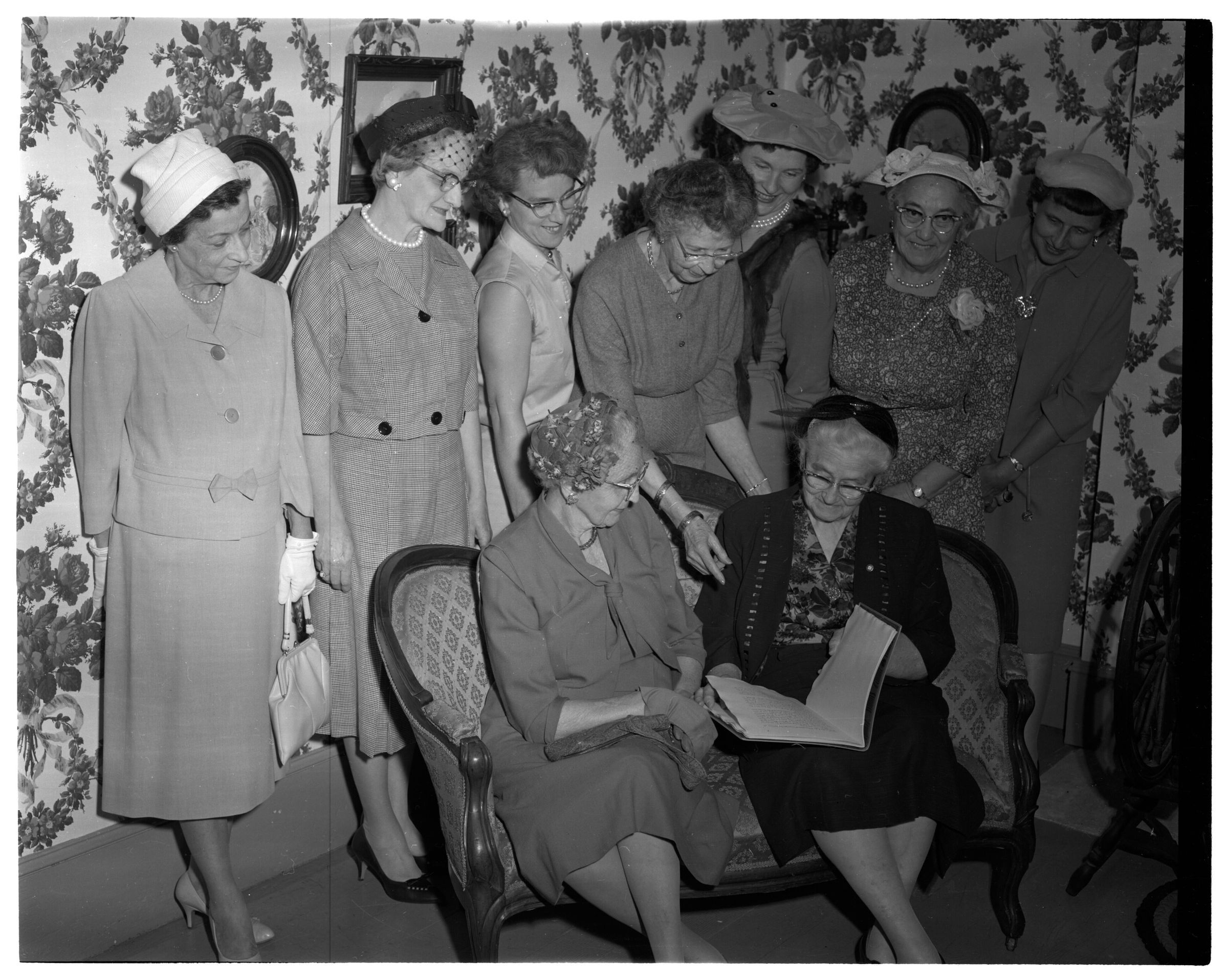Negative, sheet film. 4 x 5 b&w. No. 818. OB Corp TV. Daughters of the Pioneers of Washington at Crosby House, Tumwater. Unidentified women are looking at book on Crosby family genealogy.