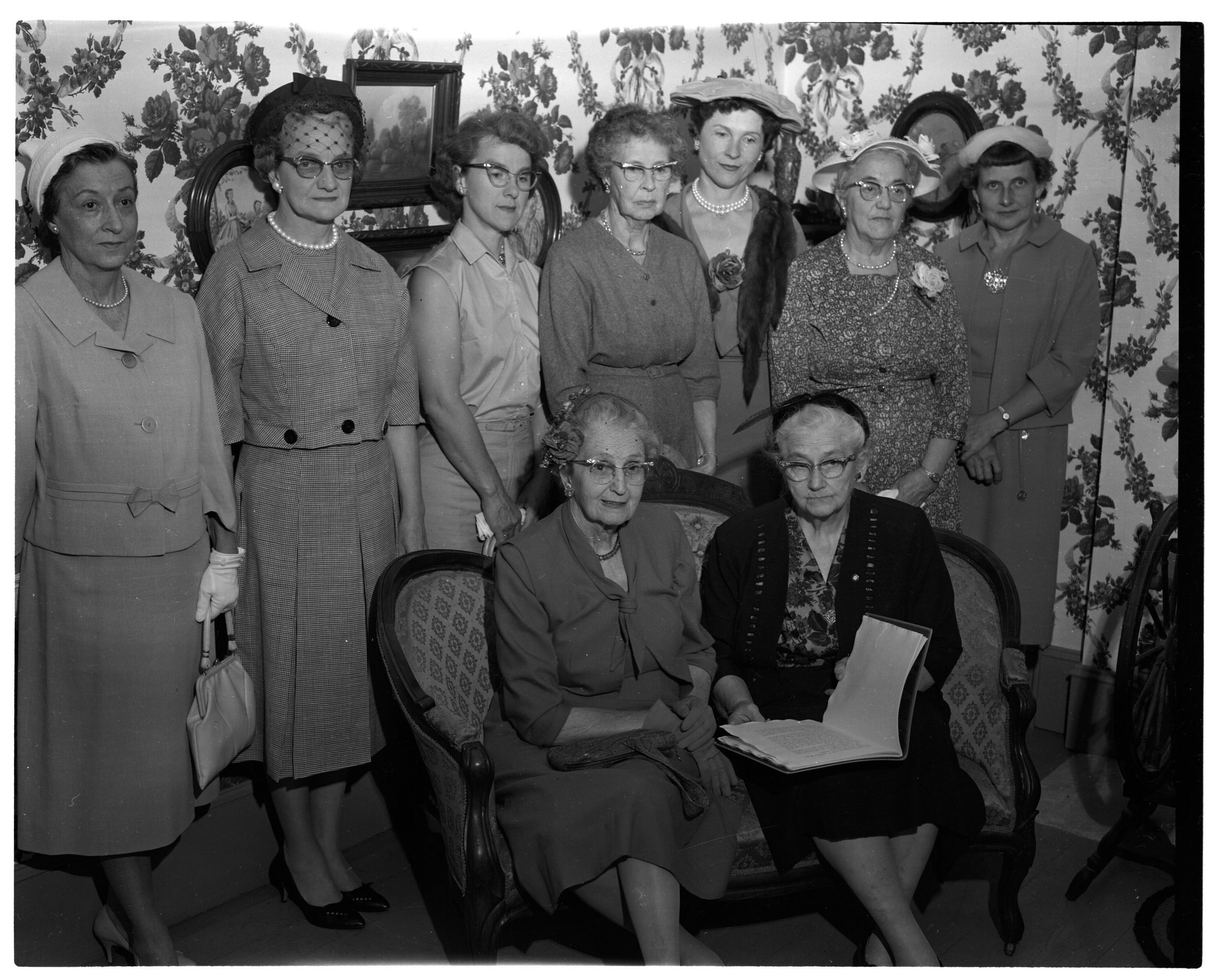 Negative, sheet film. 4 x 5 b&w. No. 818. OB Corp TV. Daughters of the Pioneers of Washington at Crosby House, Tumwater. Unidentified women are looking at book on Crosby family genealogy.