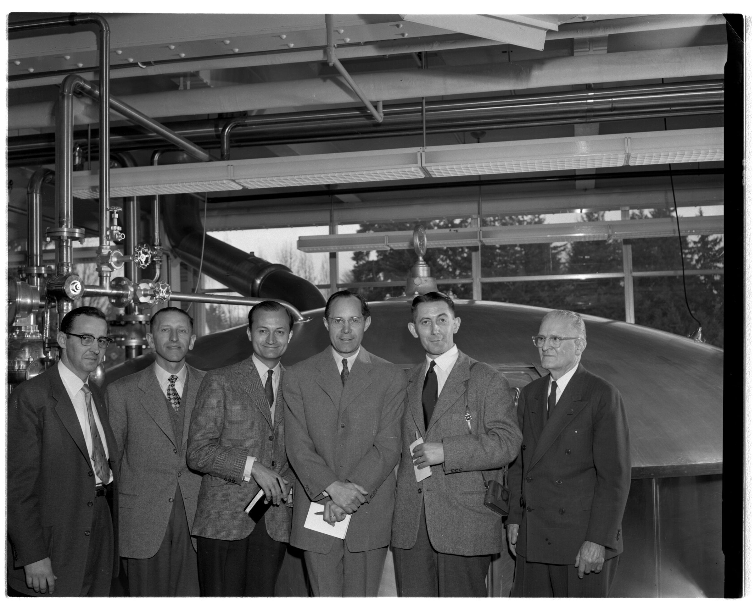 Negative, sheet film. 4 x 5 b&w. Group of French tourists or brewers touring the Olympia brewery. No ID on visitors; Bobby Schmidt at left, Peter G. Schmidt Sr. at right.