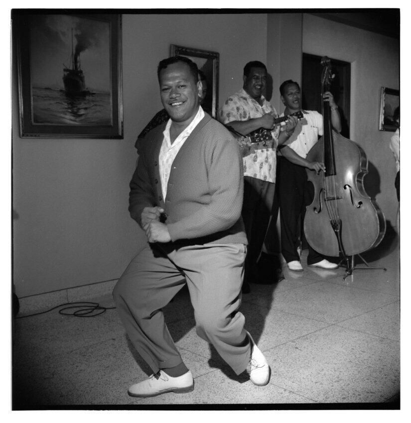 Negative, sheet film. 2 x 2 b&w. No. 914. OB Corp TV. Hawaiian village musicians visit Olympia brewery, play in hospitality room. No ID on people. Sydney Laurence paintings on wall behind musicians.Name/Title