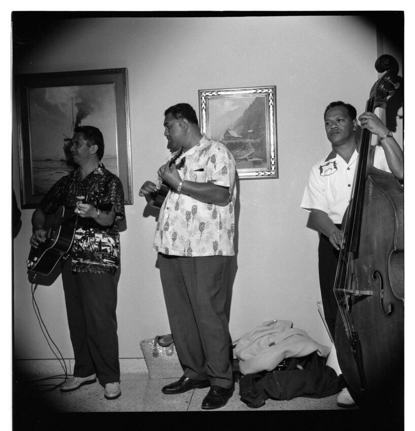 Negative, sheet film. 2 x 2 b&w. No. 914. OB Corp TV. Hawaiian village musicians visit Olympia brewery, play in hospitality room. No ID on people. Sydney Laurence paintings on wall behind musicians.Name/Title