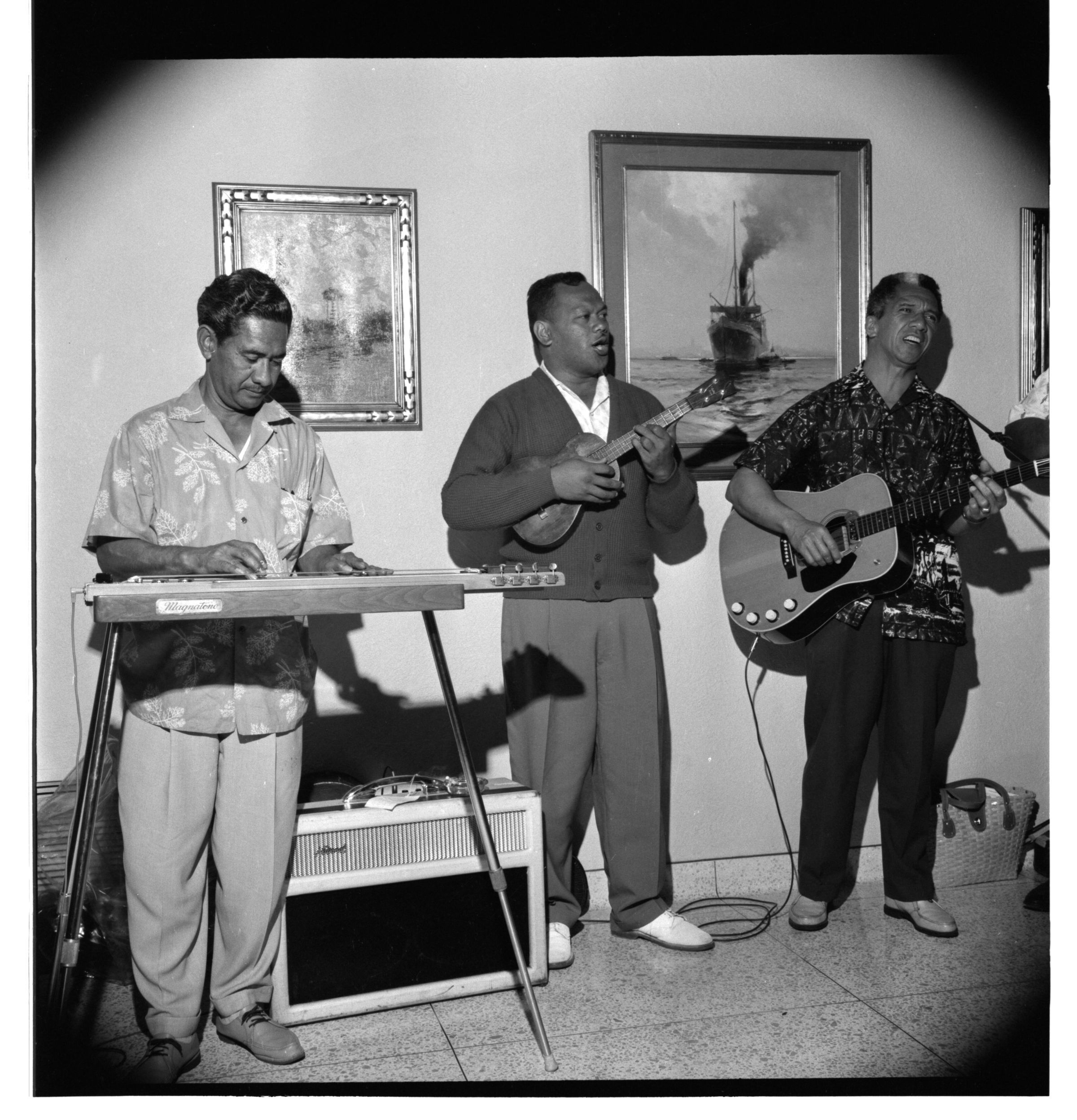 Negative, sheet film. 2 x 2 b&w. No. 914. OB Corp TV. Hawaiian village musicians visit Olympia brewery, play in hospitality room. No ID on people. Sydney Laurence paintings on wall behind musicians.Name/Title