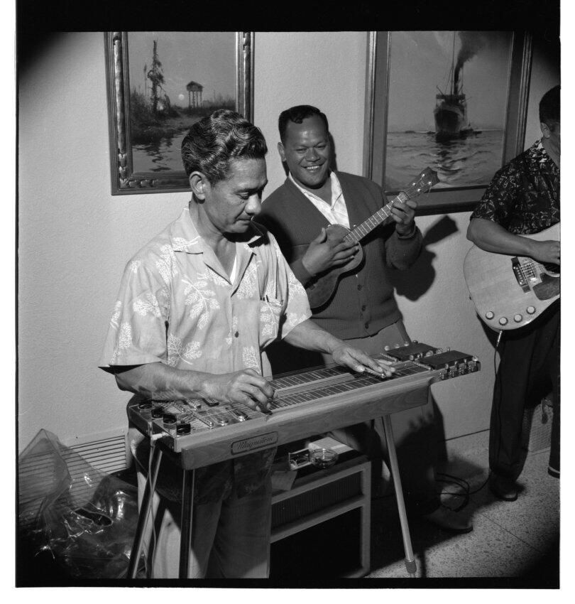 Negative, sheet film. 2 x 2 b&w. No. 914. OB Corp TV. Hawaiian village musicians visit Olympia brewery, play in hospitality room. No ID on people. Sydney Laurence paintings on wall behind musicians.Name/Title