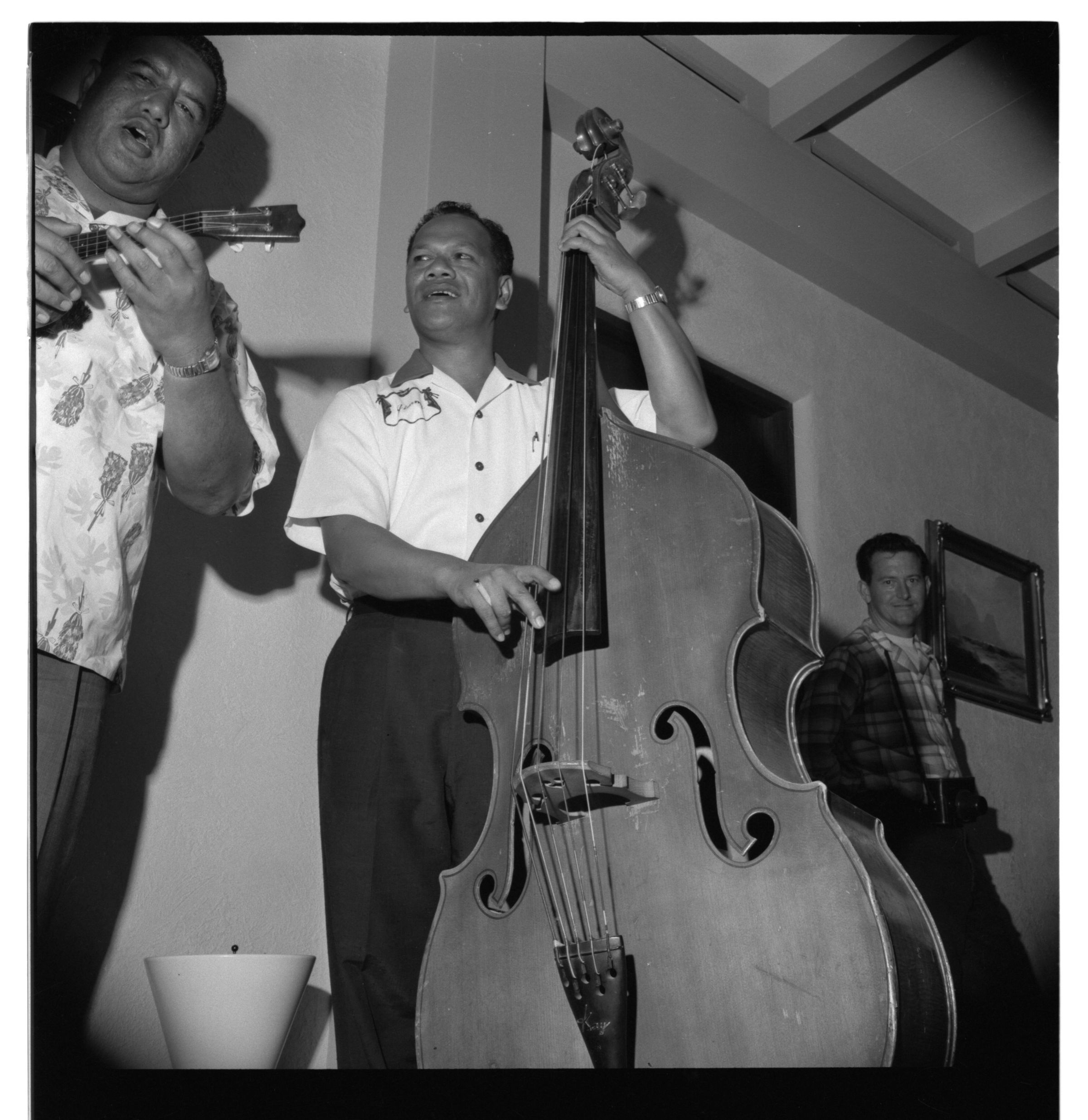 Negative, sheet film. 2 x 2 b&w. No. 914. OB Corp TV. Hawaiian village musicians visit Olympia brewery, play in hospitality room. No ID on people. Sydney Laurence paintings on wall behind musicians.Name/Title