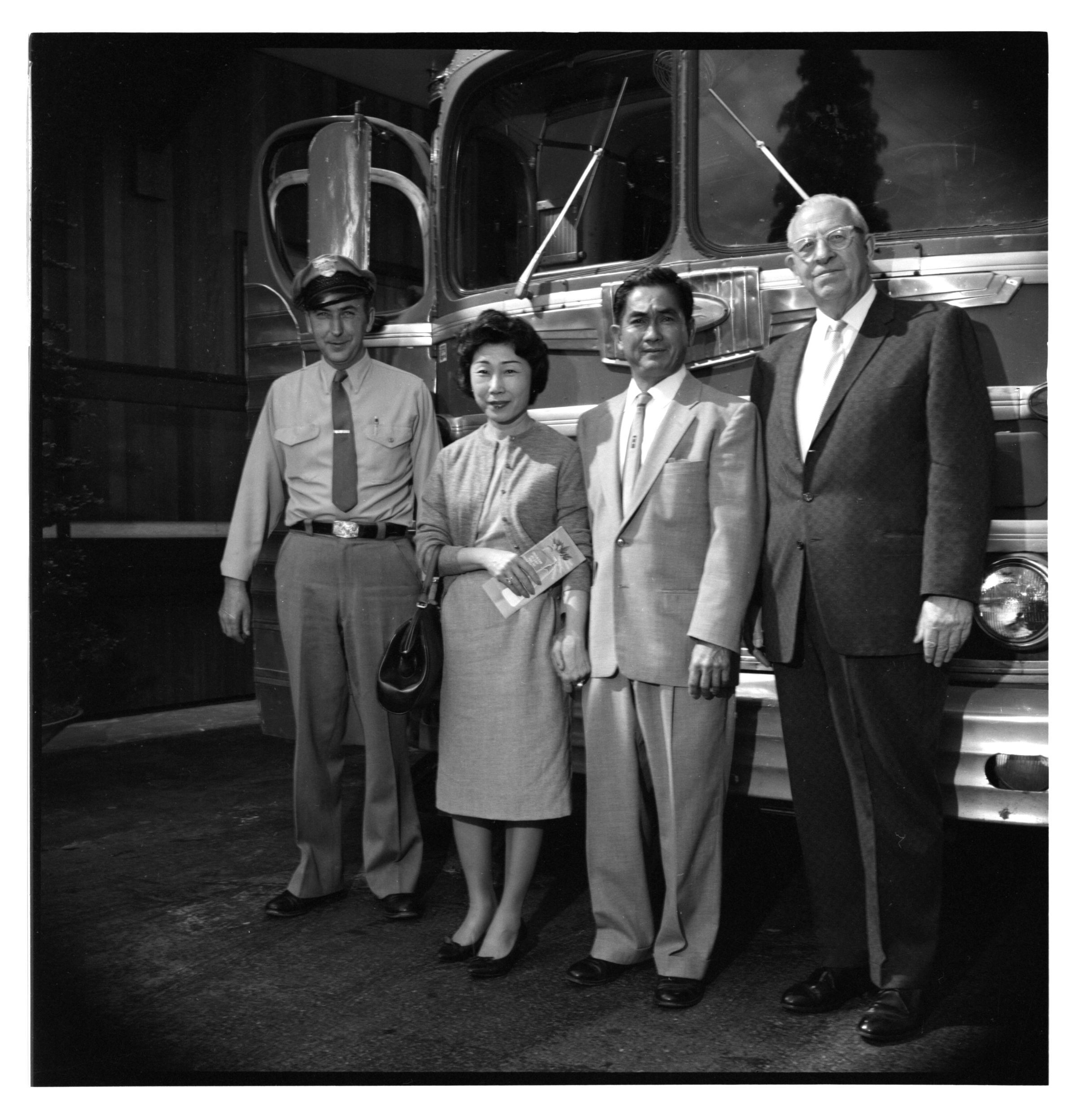 Negative, sheet film. 2 x 2 b&w. Japanese visitors on tour of Olympia brewery with Art Halgren, OBC VP Sales.