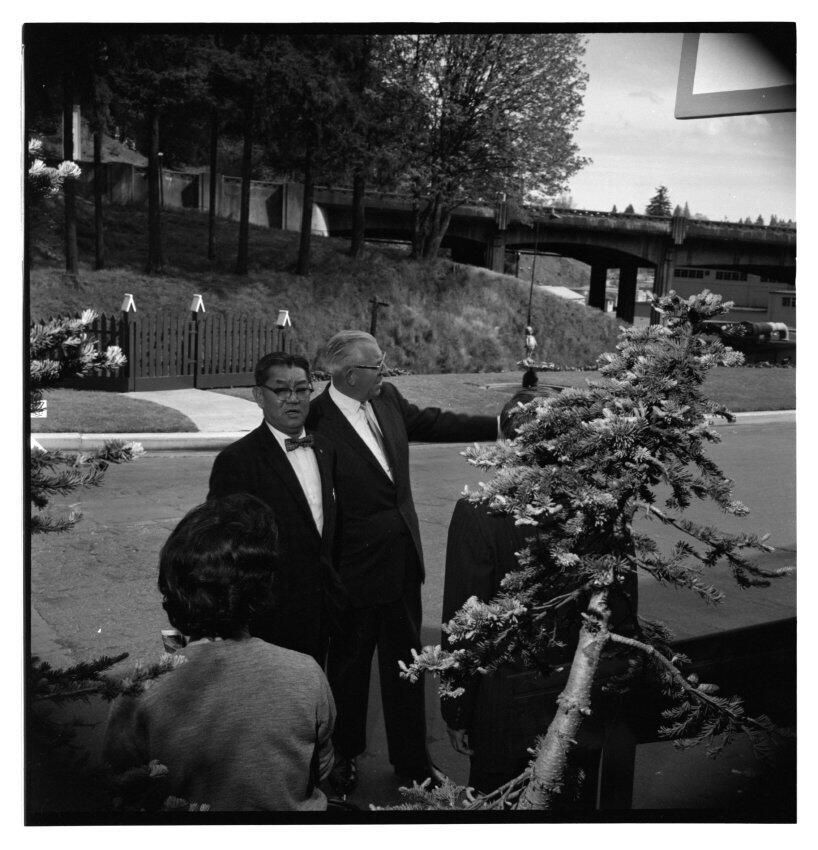 Negative, sheet film. 2 x 2 b&w. Japanese visitors on tour of Olympia brewery with Art Halgren, OBC VP Sales.