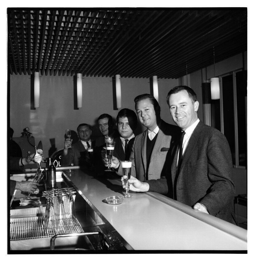 Negative, sheet film. 2 x 2 b&w. The Lancers (singing group) tour Olympia brewery. No ID on people.