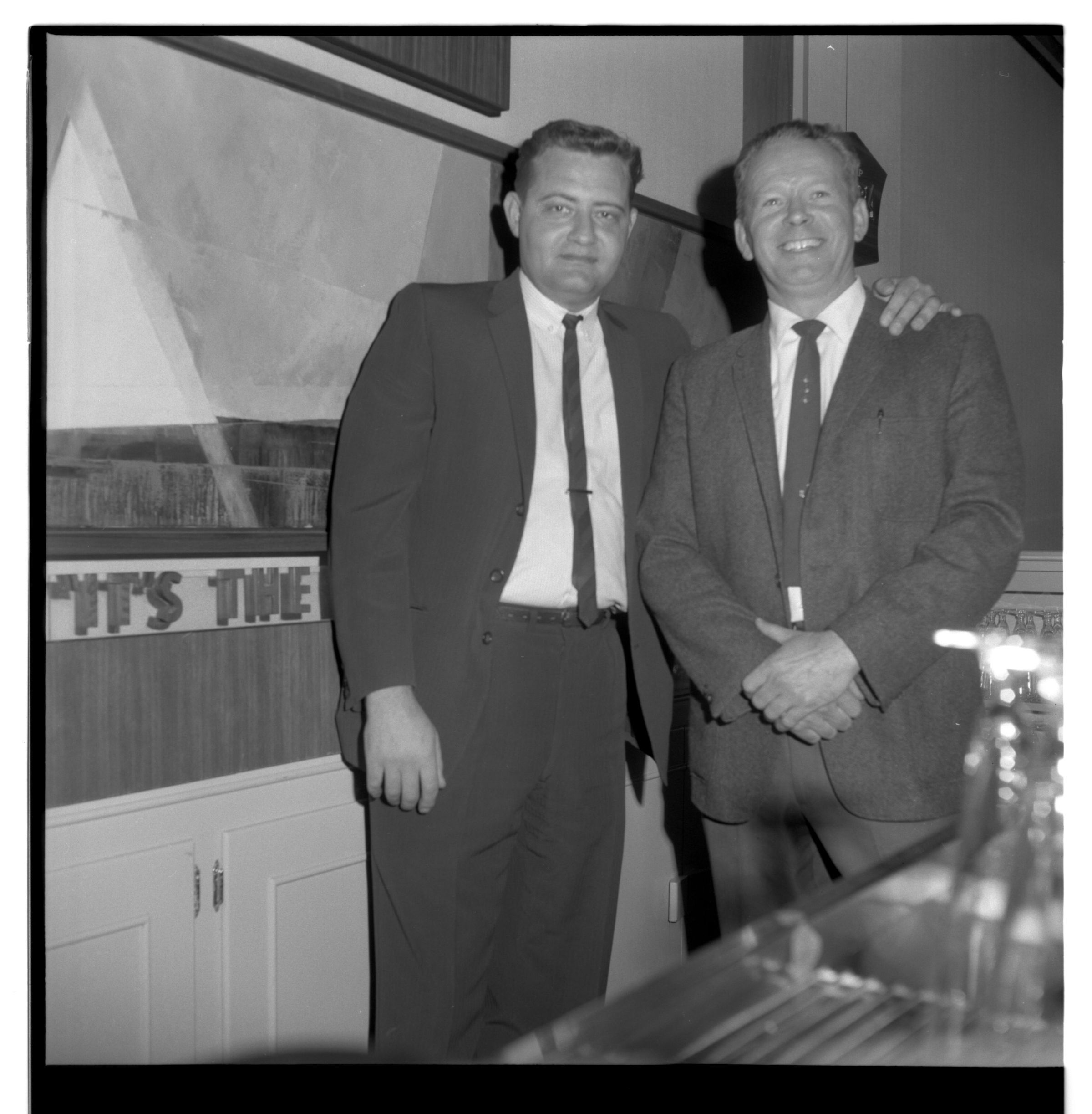 Negative, sheet film. 2 x 2 b&w. The Lancers (singing group) tour Olympia brewery. No ID on people.