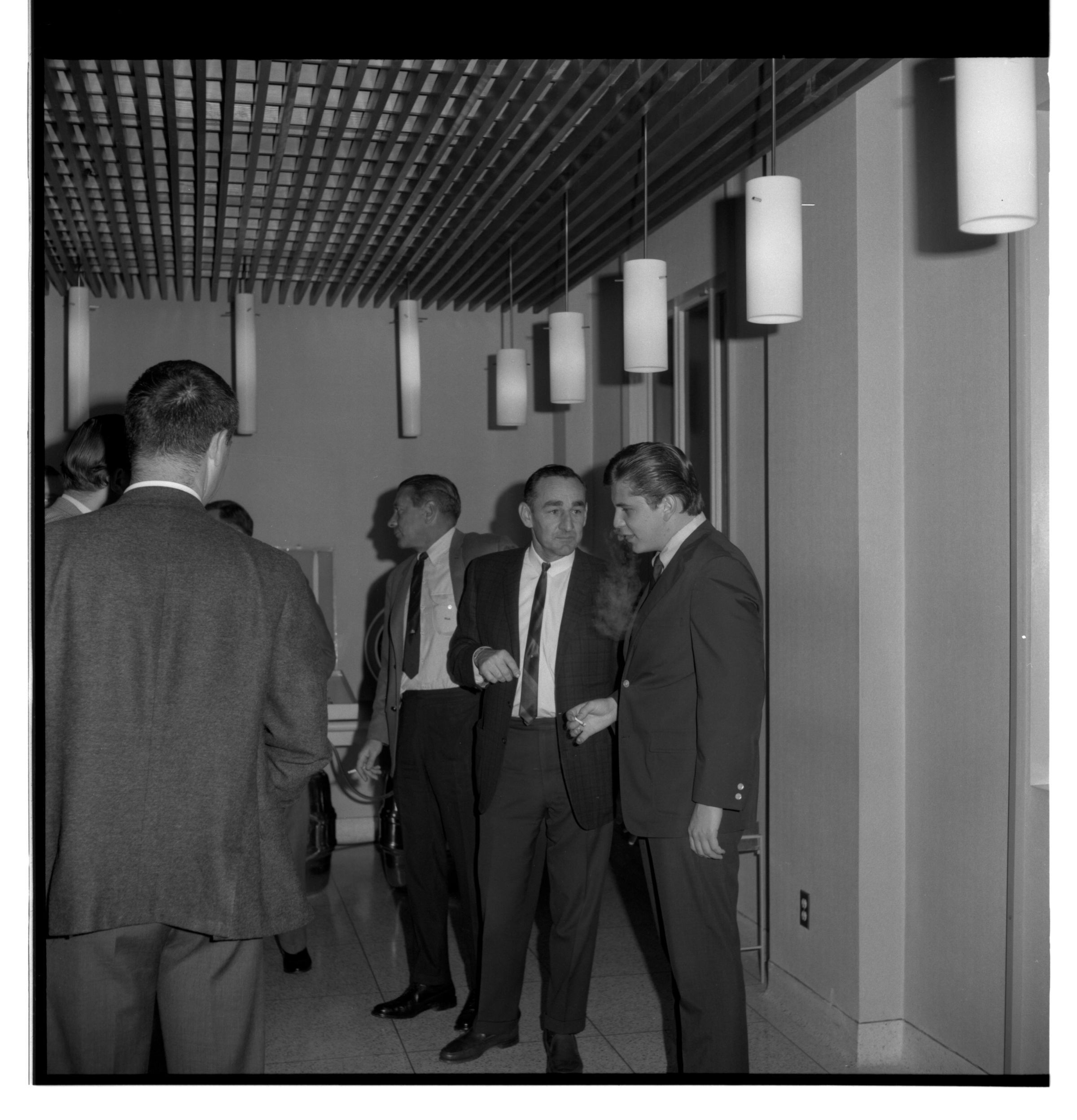 Negative, sheet film. 2 x 2 b&w. The Lancers (singing group) tour Olympia brewery. Bink Schmidt second from right. No ID on others.