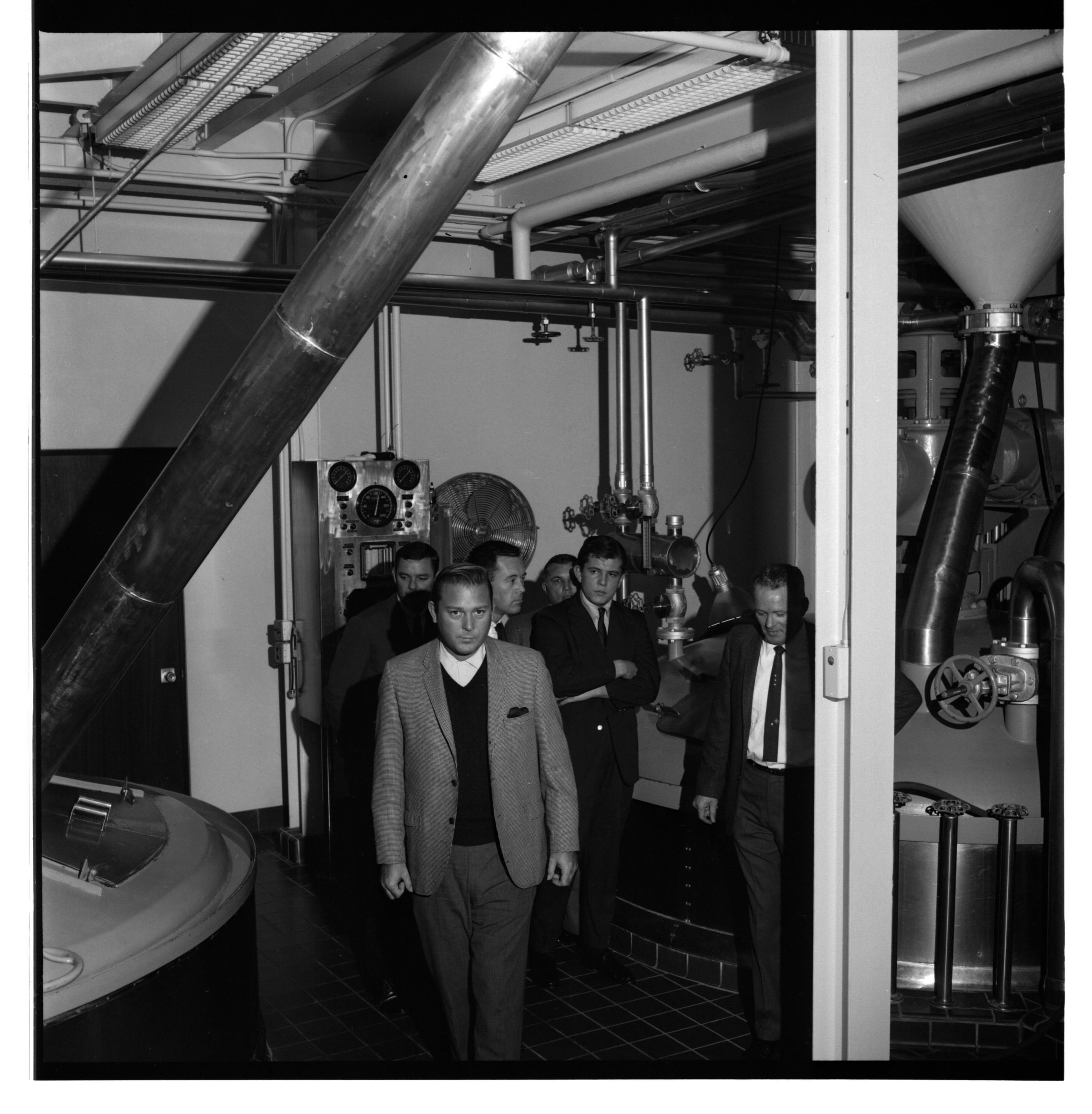 Negative, sheet film. 2 x 2 b&w. The Lancers (singing group) tour Olympia brewery. No ID on people.