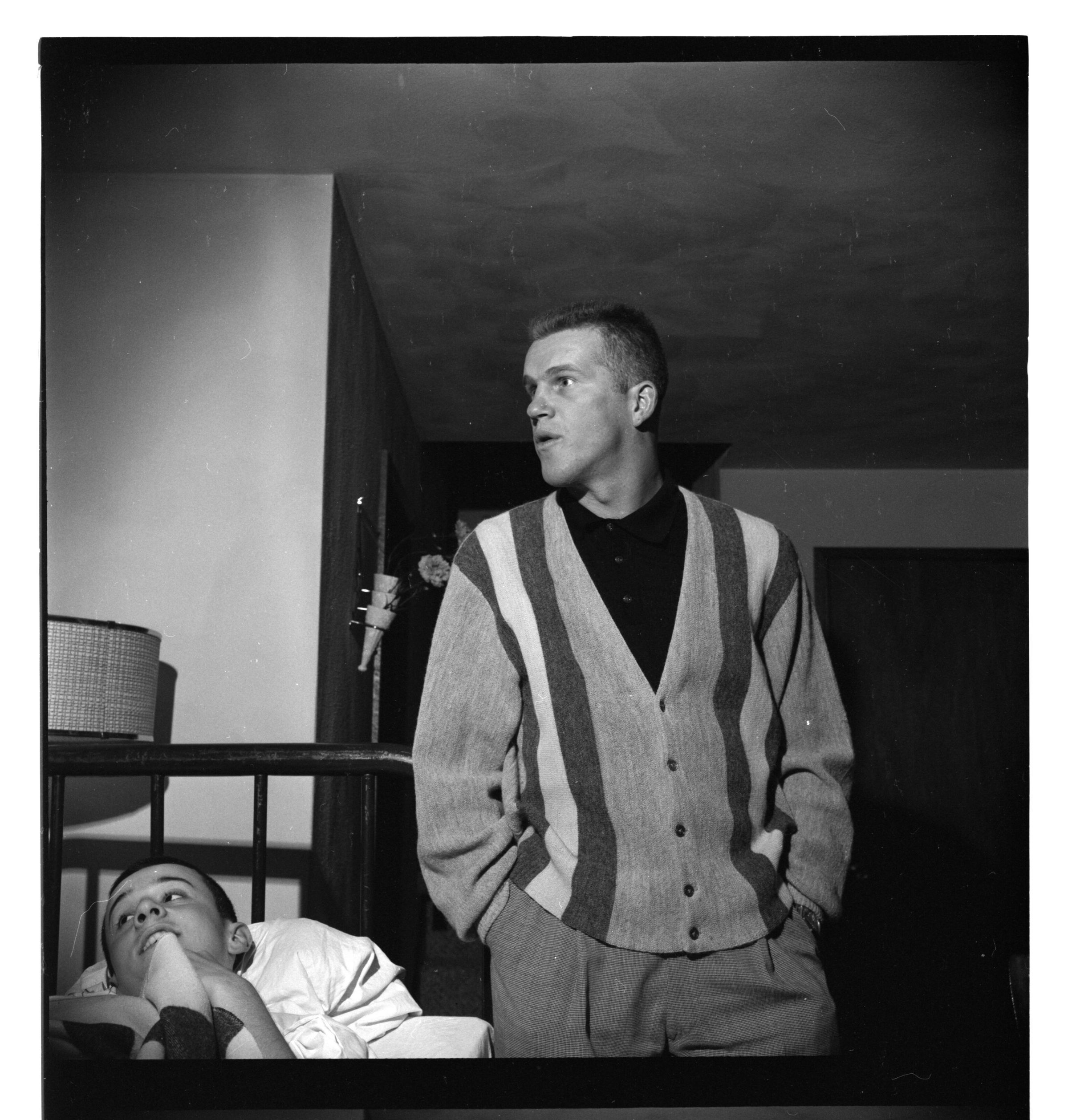 Negative, sheet film. 2 x 2 b&w. No. 827. OB Corp TV. Tony Kubek (NY Yankees' shortstop) and his wife visit some sort of nursing facility (in Olympia?)