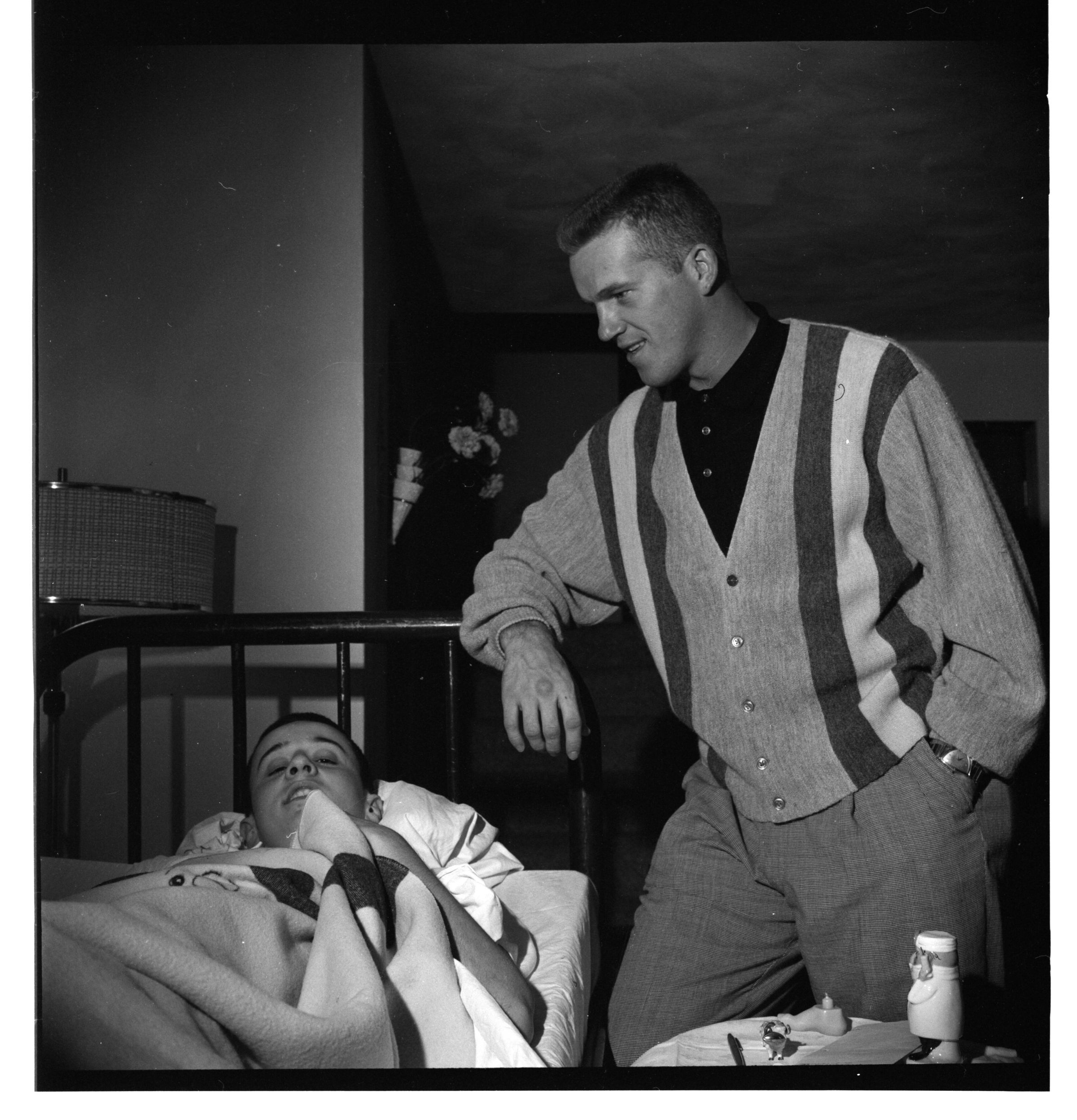 Negative, sheet film. 2 x 2 b&w. No. 827. OB Corp TV. Tony Kubek (NY Yankees' shortstop) and his wife visit some sort of nursing facility (in Olympia?)