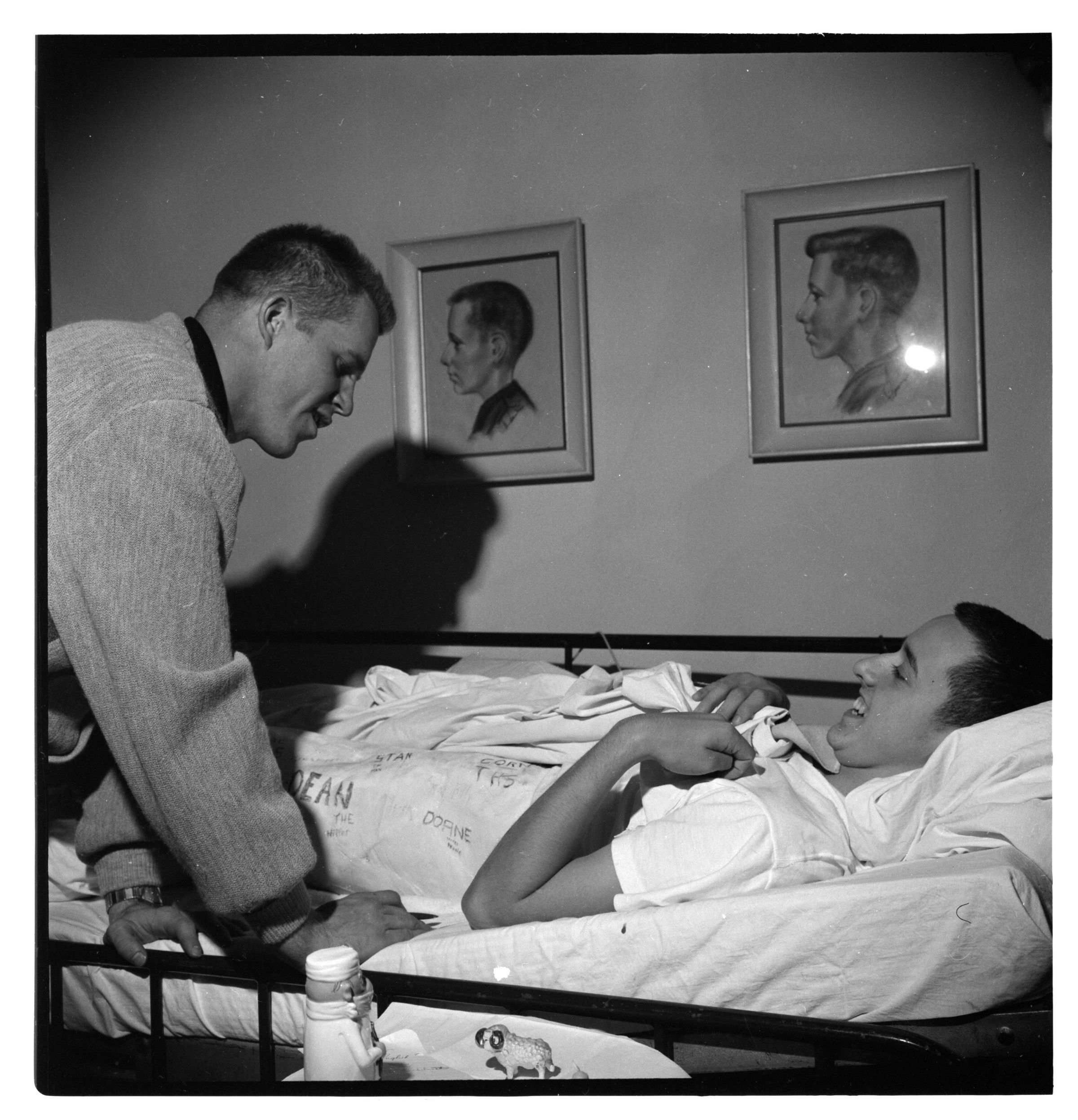 Negative, sheet film. 2 x 2 b&w. No. 827. OB Corp TV. Tony Kubek (NY Yankees' shortstop) and his wife visit some sort of nursing facility (in Olympia?)